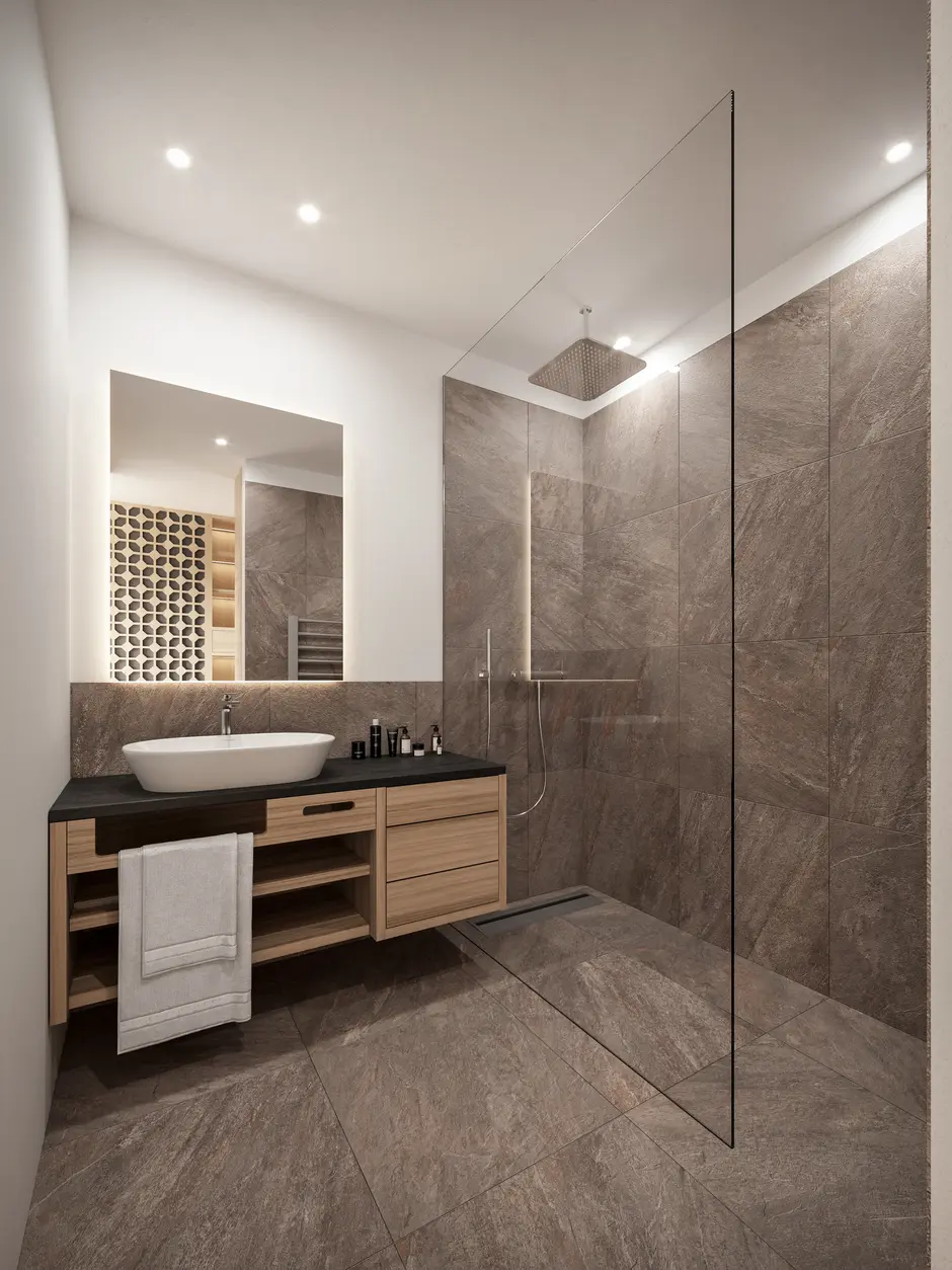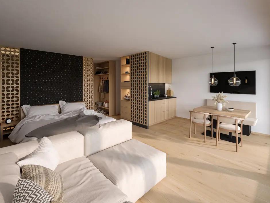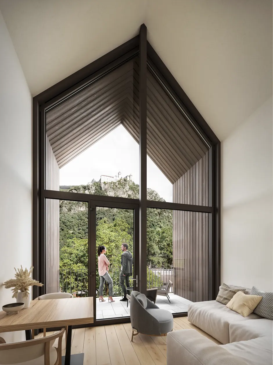 Per la progettazione si è puntato su materiali locali e durevoli: legno di larice spazzolato e scolorito dal sole, pietra naturale e metallo scuro verniciato conferiscono agli edifici un’eleganza sobria. La struttura lignea si estende senza soluzione di continuità dalla facciata al tetto, conferendo ai corpi edilizi un aspetto armonioso. Le finestre con telaio in legno e le sottili ringhiere metalliche si inseriscono naturalmente nel contesto, richiamando al contempo l’architettura esistente dell’Ansitz.