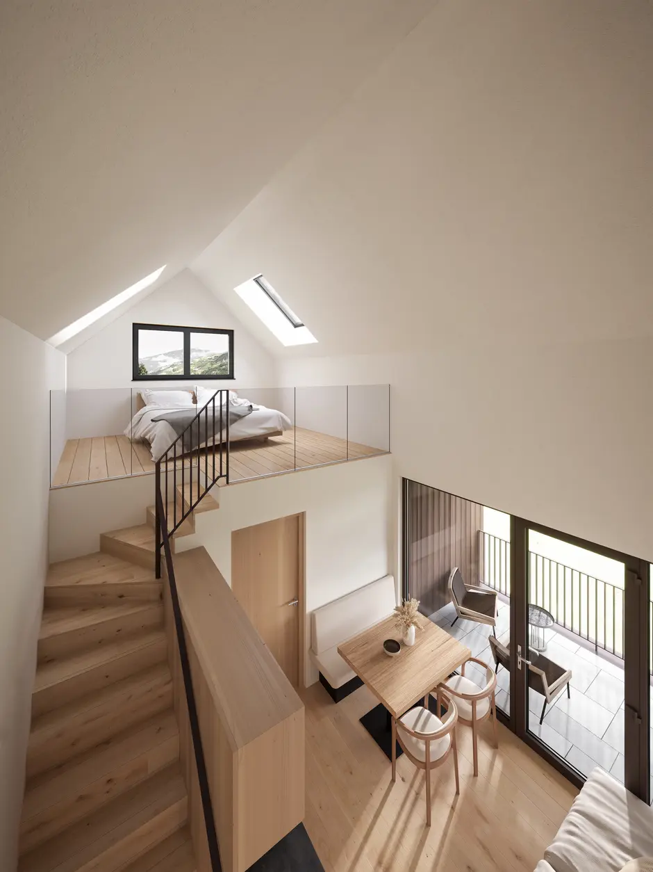 Il nuovo insieme architettonico è costituito da sei chalet compatti a due piani, inseriti nella ripida topografia del versante nord-occidentale boschivo e rialzati su pilastri. La disposizione sfalsata degli edifici lungo l’andamento naturale del terreno e l’accesso posteriore tramite un sentiero garantiscono la massima privacy e tranquillità.