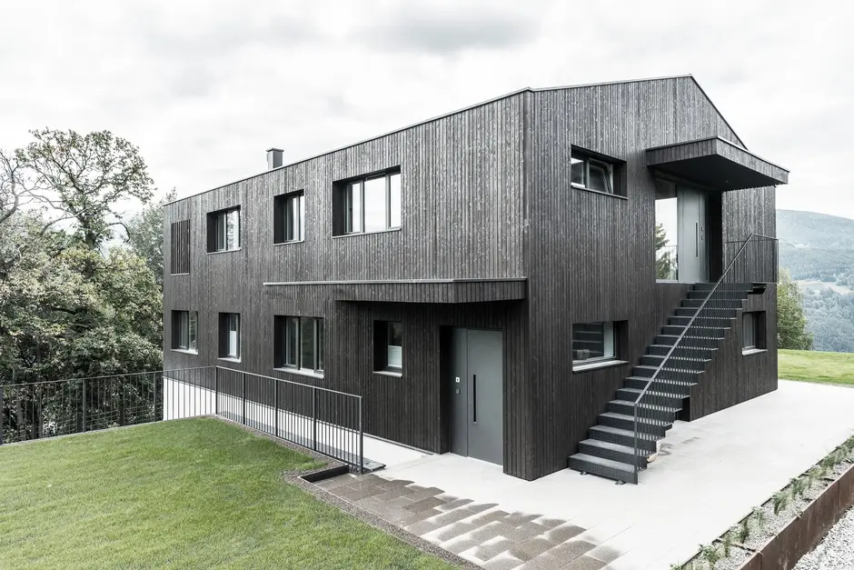 Per la facciata è stato utilizzato legno di castagno segato grezzo e non trattato, sottoposto poi a rusticatura con spazzole d’acciaio per farne emergere le venature.