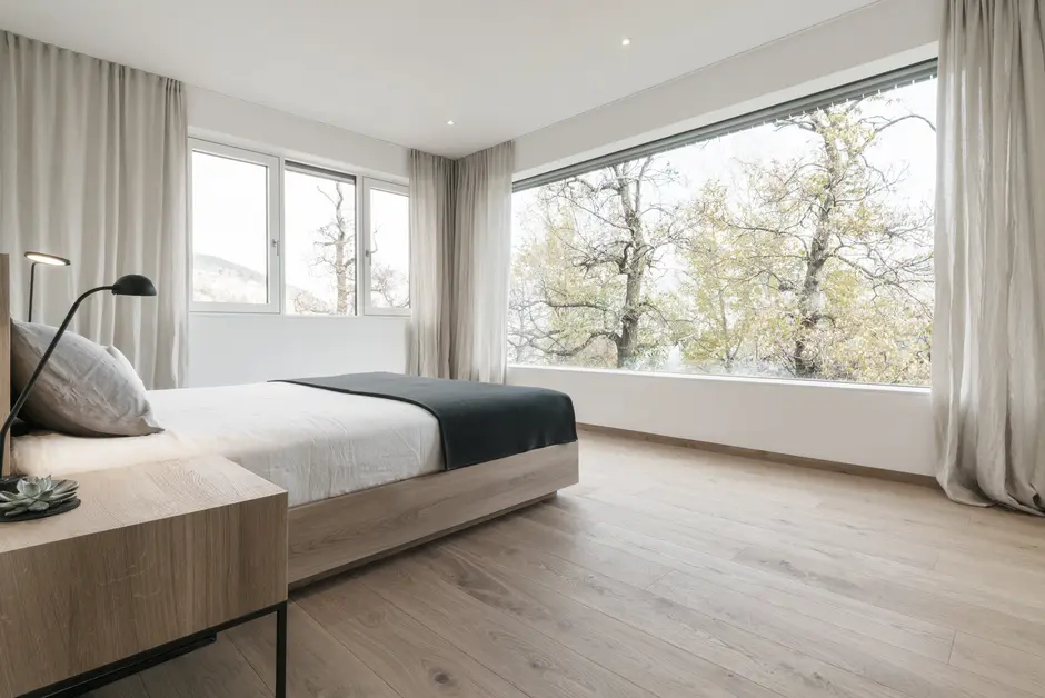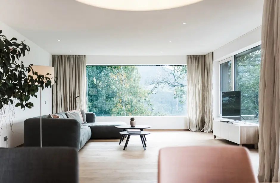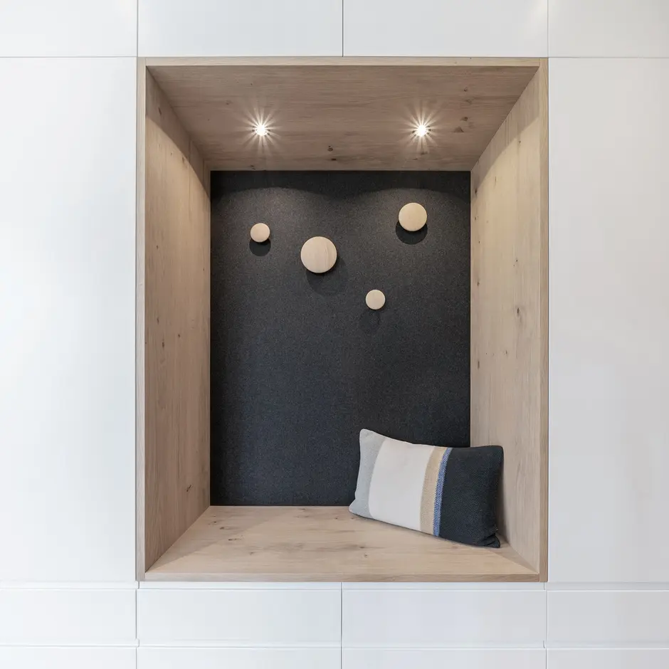 L’armonia dei materiali si riflette anche all’interno dell’edificio, con pavimenti in legno e pietra naturale. Per le pareti sono stati scelti intonaci di calce e argilla che, grazie alla capacità di assorbire e rilasciare l’umidità, contribuiscono a creare un ambiente salubre.