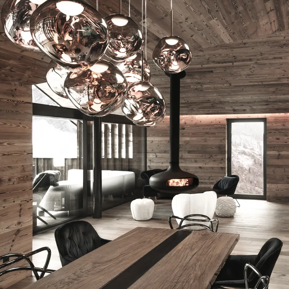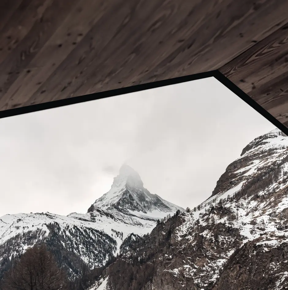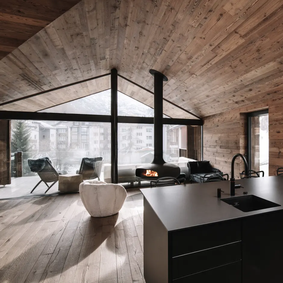 Abitare modernamente in stile svizzero: uno spazioso soggiorno sotto un tetto a falde, interamente rivestito con tavole di legno antico brunite dal sole, con vista sull'imponente Cervino attraverso la vetrata a timpano.