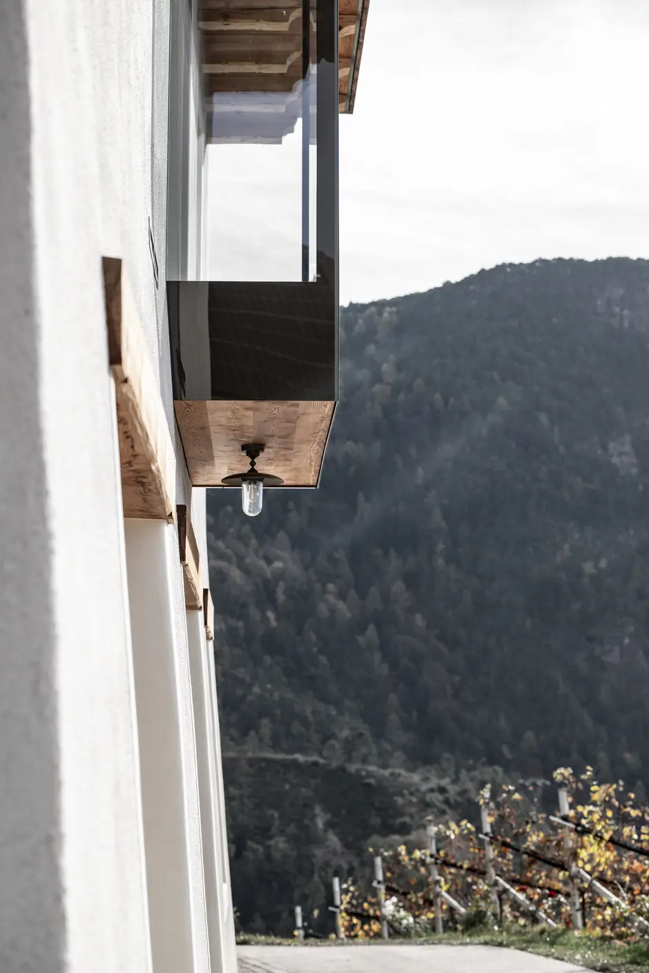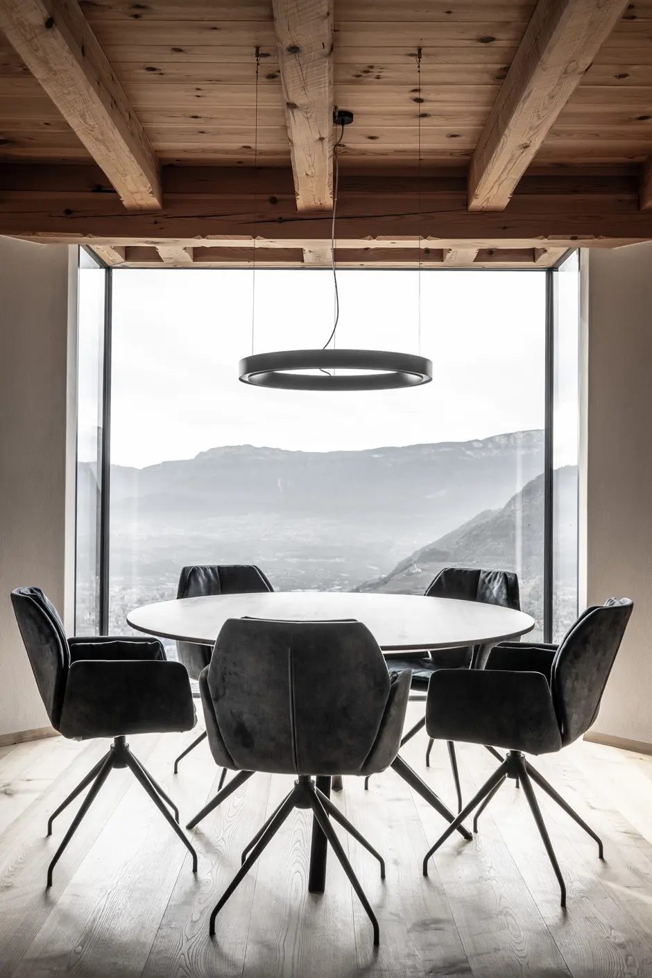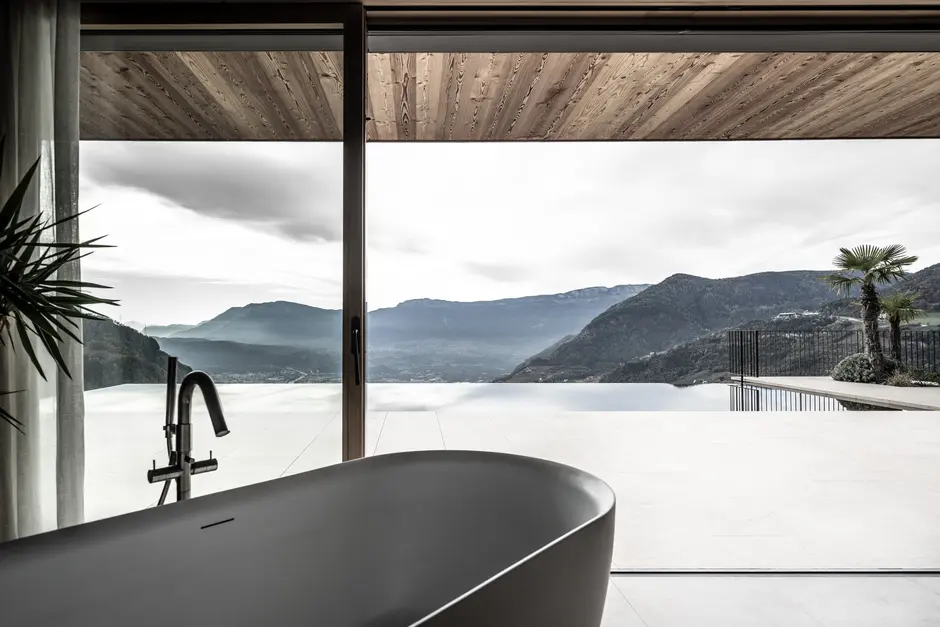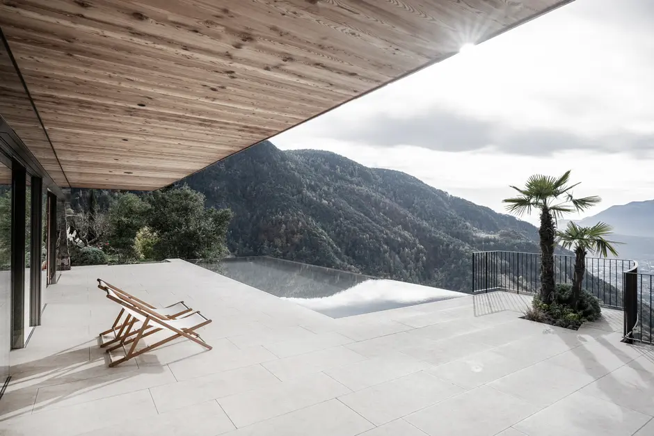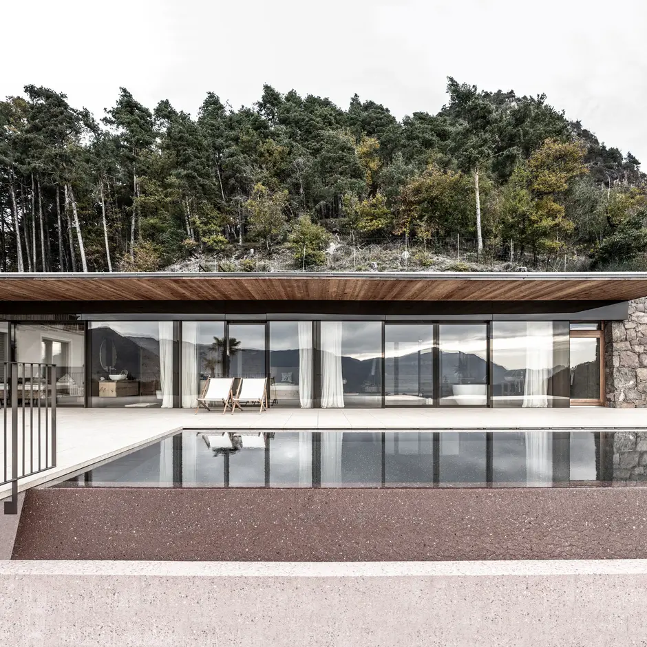 All’interno trovano spazio due ampie unità abitative con accessi indipendenti. Le grandi aperture incorniciano vedute mirate verso le montagne altoatesine. Legno, calcestruzzo a vista e intonaco di calce conferiscono un senso di radicamento materiale e tranquillità atmosferica. Piscina esterna, area wellness e terrazze definiscono le zone di ritiro privato e prolungano la vita domestica nel paesaggio.