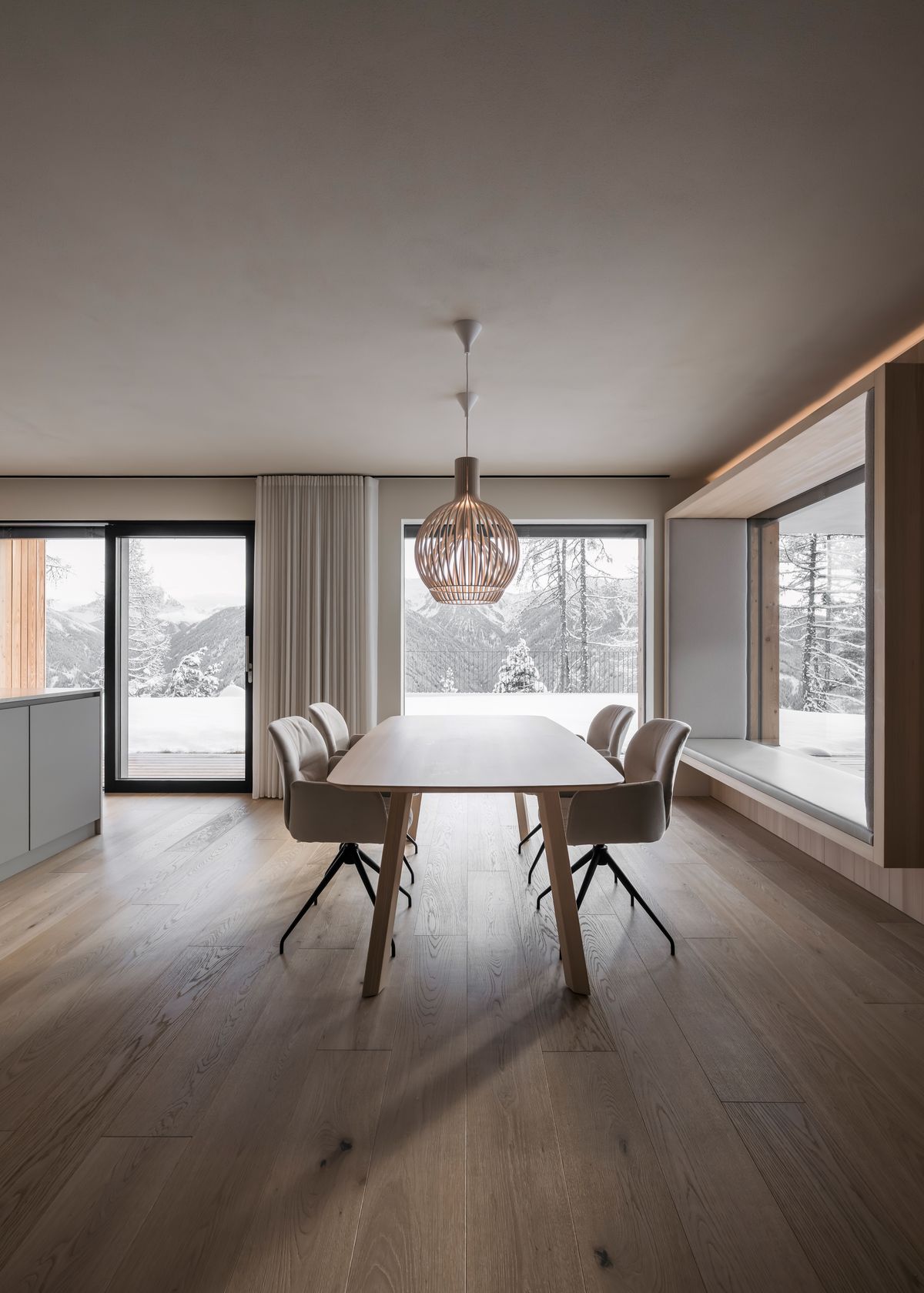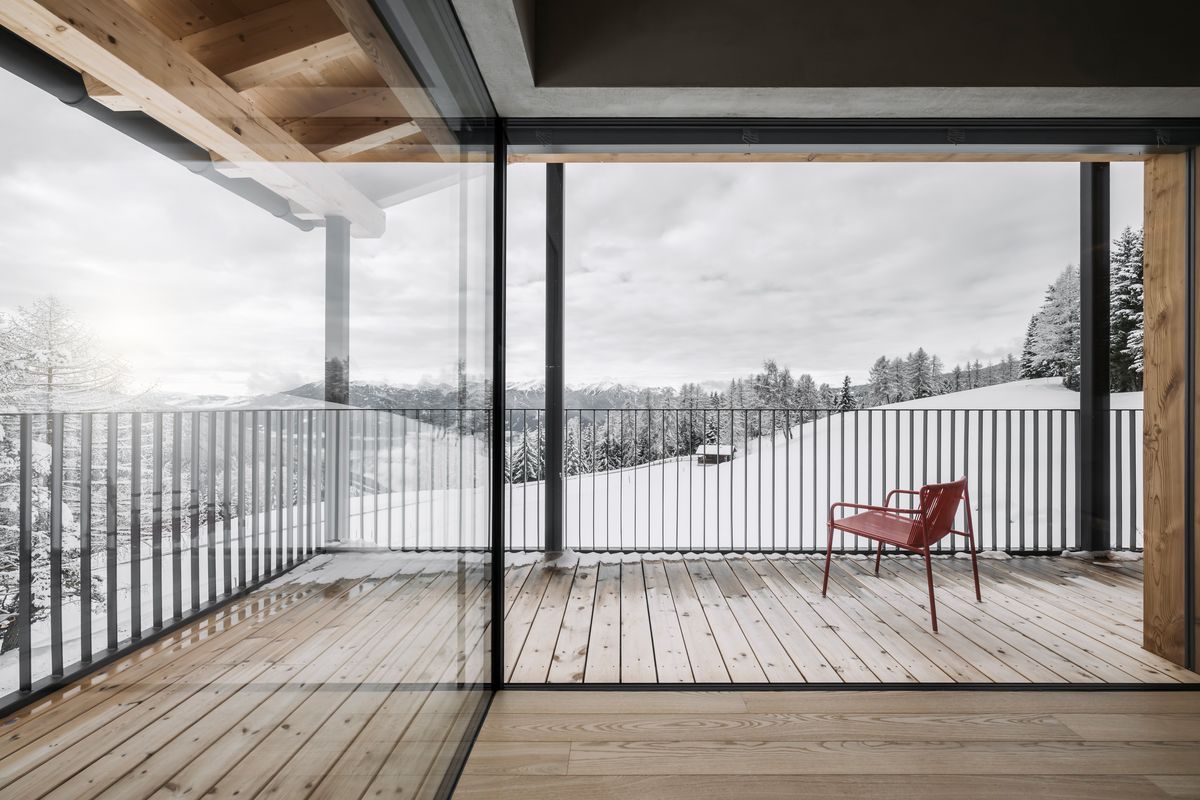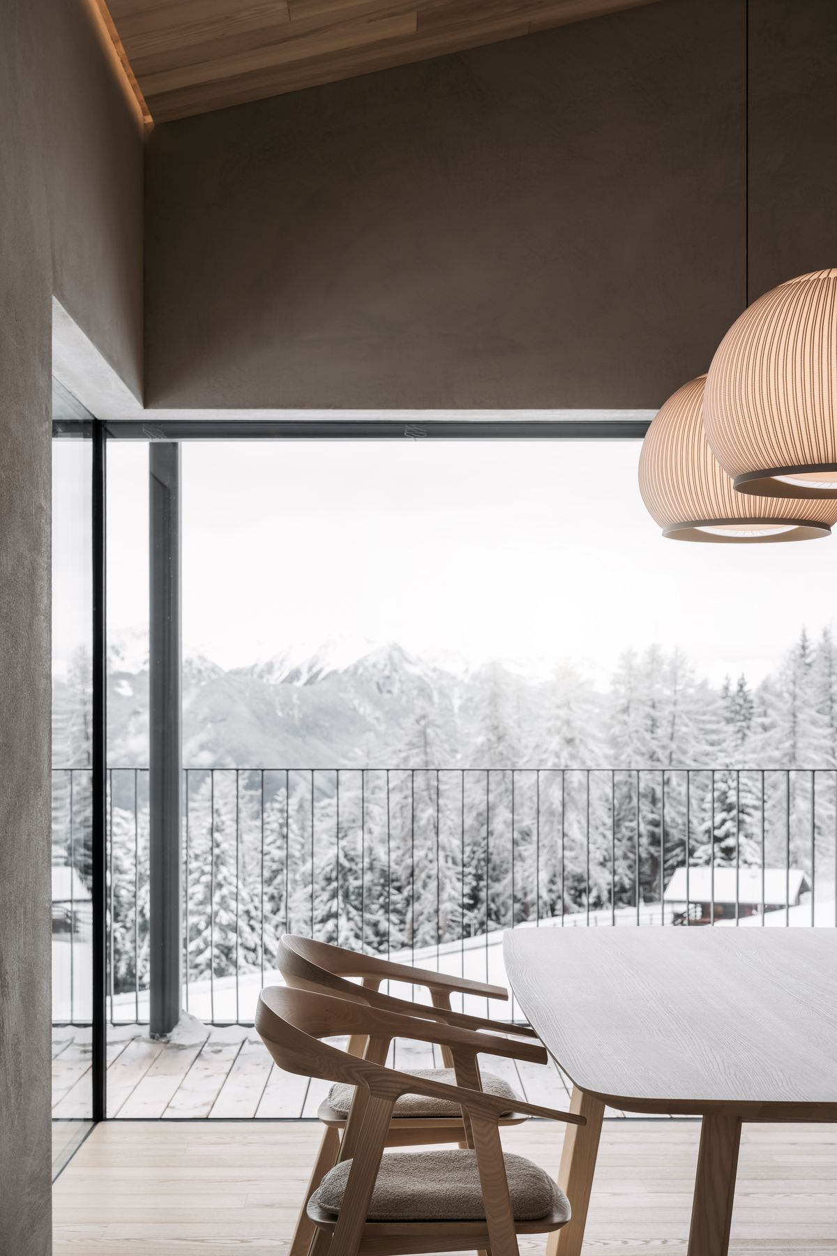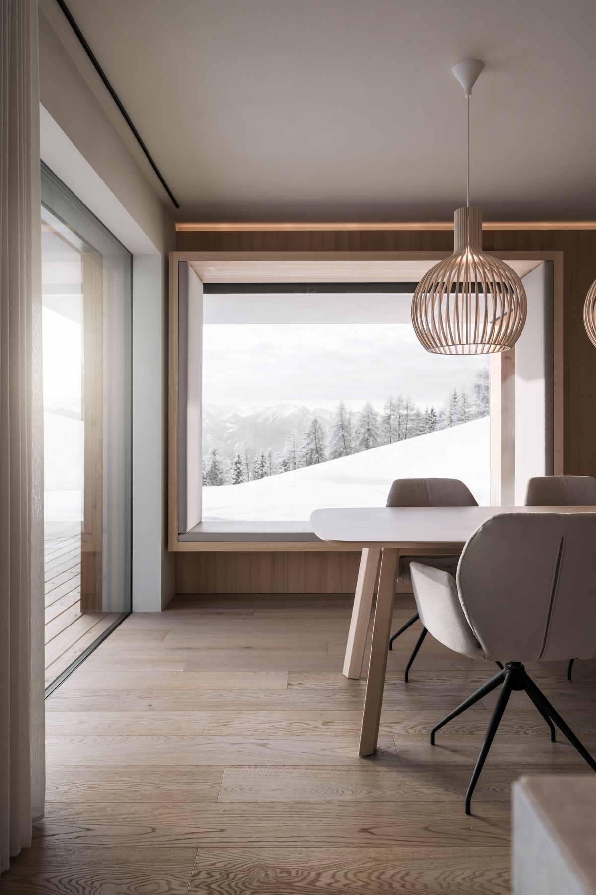 Entrambi gli appartamenti privati si aprono con grandi vetrate verso il paesaggio; interno ed esterno si fondono, rendendo montagne, boschi e cielo parte integrante dell’abitare.