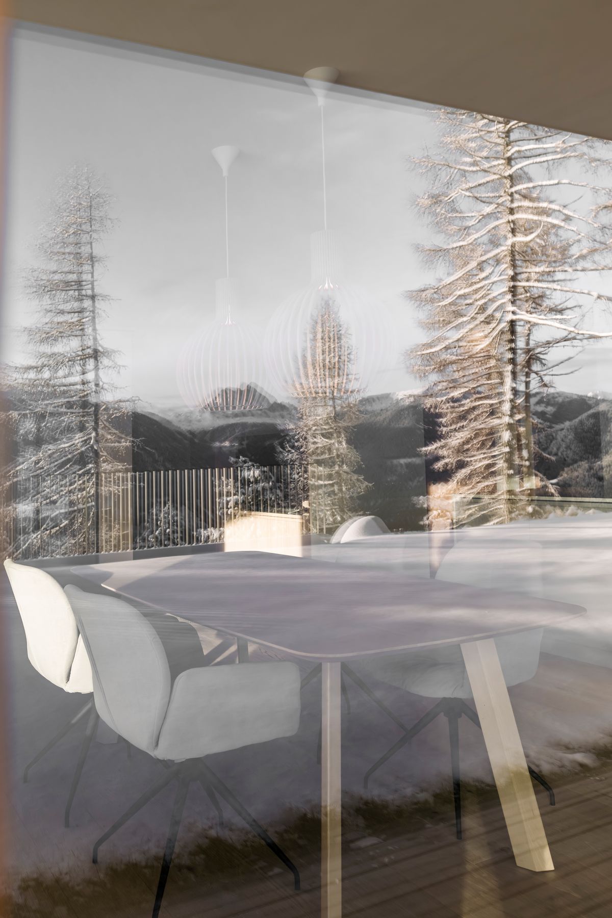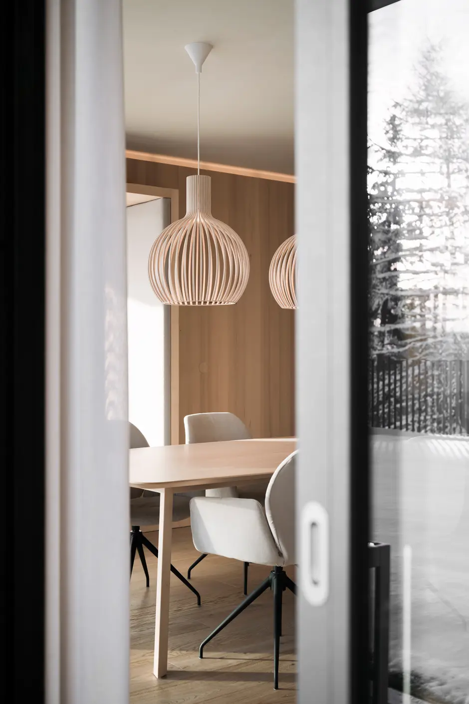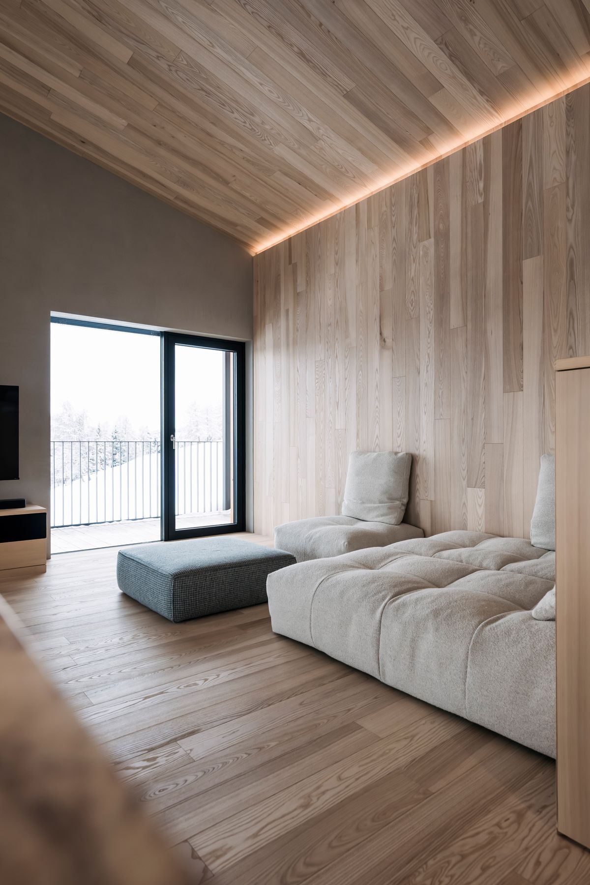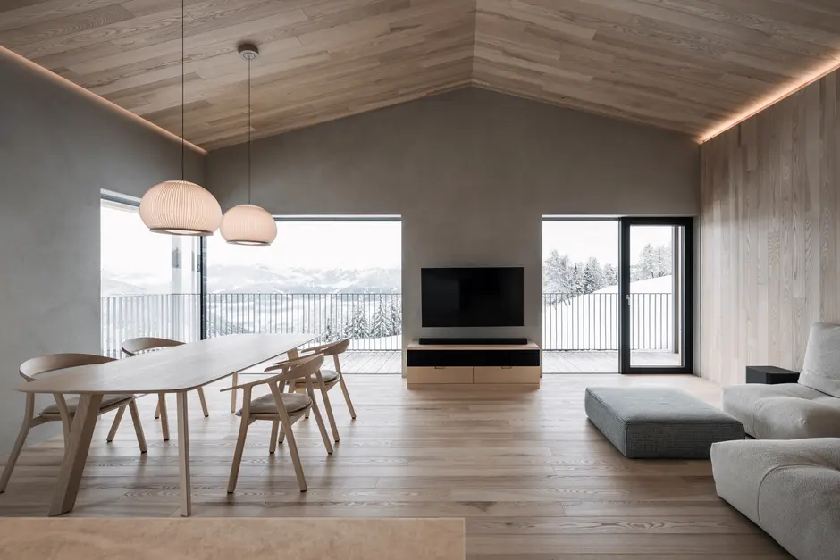 Entrambi gli appartamenti privati si aprono con grandi vetrate verso il paesaggio; interno ed esterno si fondono, rendendo montagne, boschi e cielo parte integrante dell’abitare.