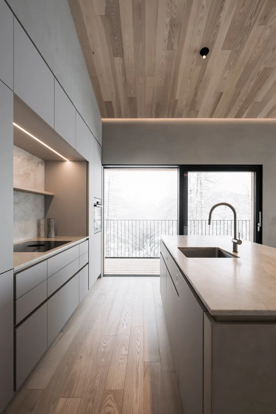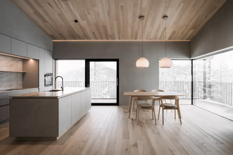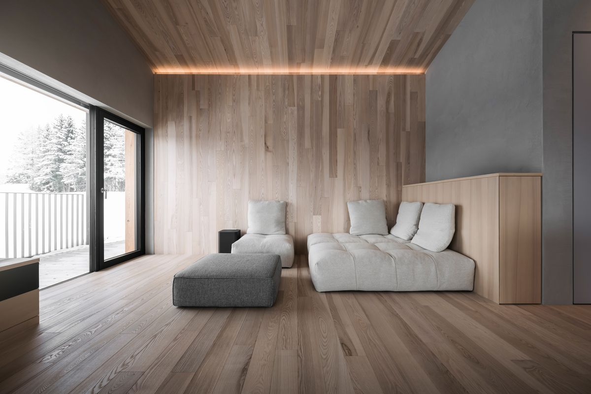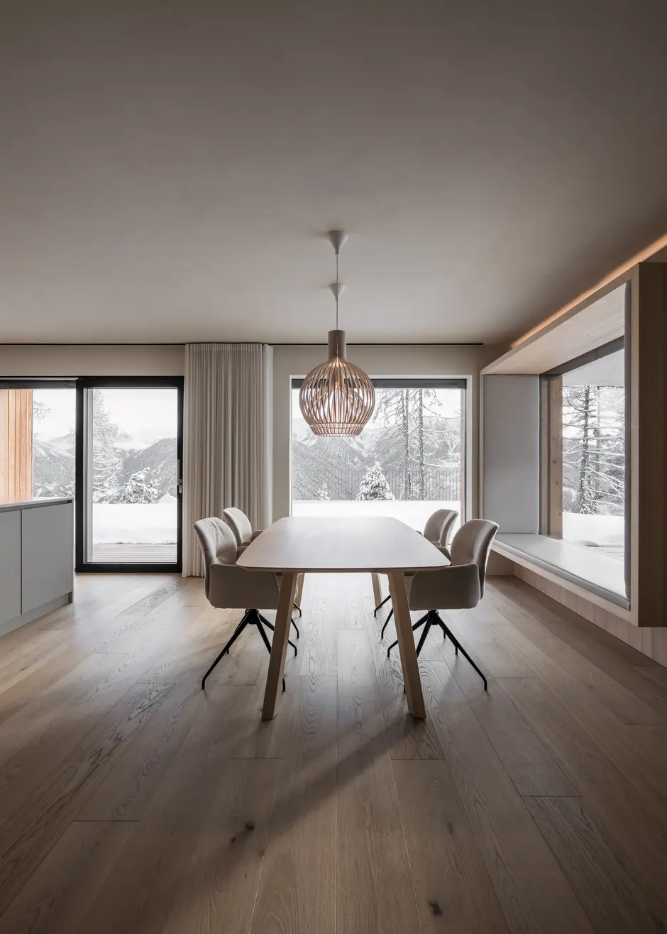 Entrambi gli appartamenti privati si aprono con grandi vetrate verso il paesaggio; interno ed esterno si fondono, rendendo montagne, boschi e cielo parte integrante dell’abitare.