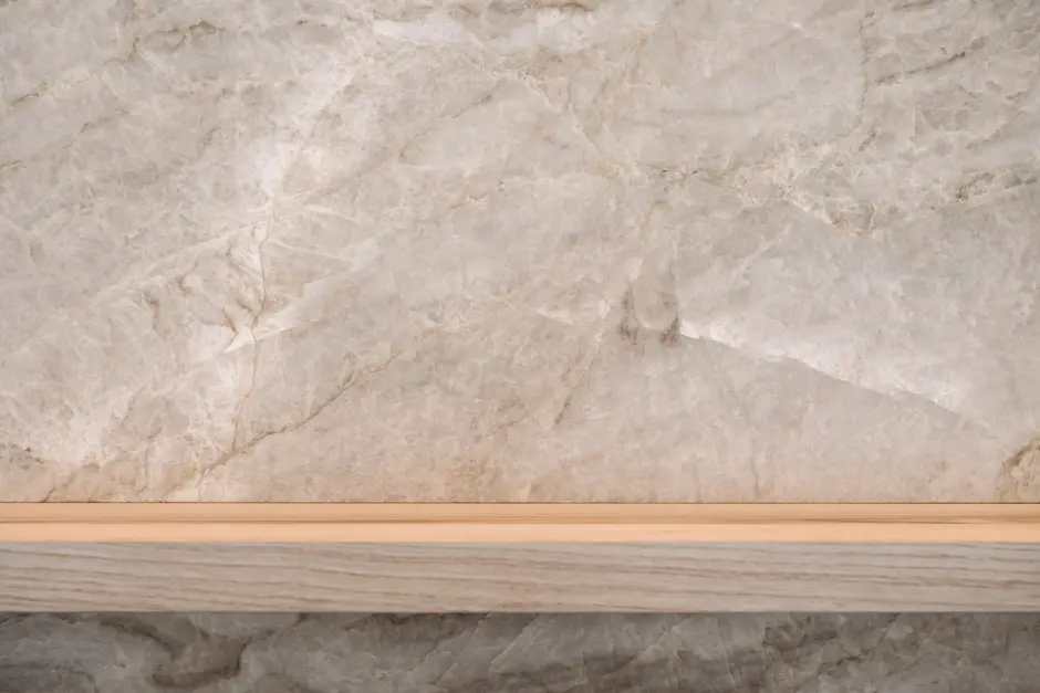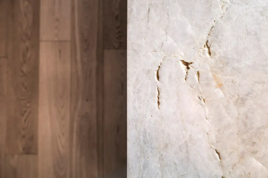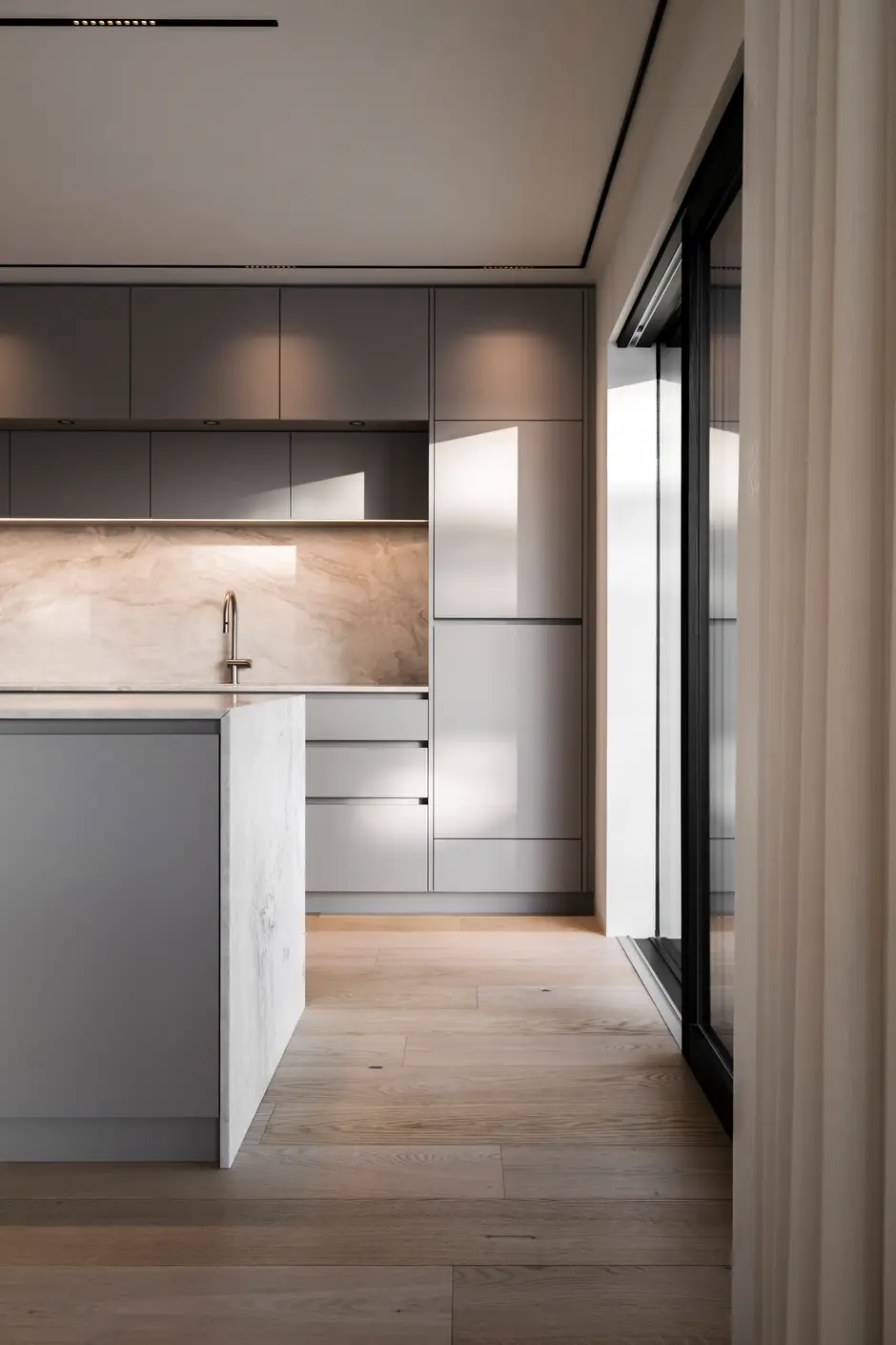 Pavimenti e superfici in frassino e abete bianco, finiture a calce in delicato grigio, tessuti in lino e lana naturale e un blocco cucina scolpito con precisione in quarzite e finitura Fenix compongono un insieme armonico.