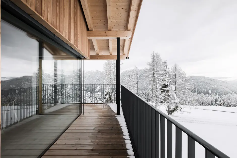 Ispirandosi ai masi tradizionali della Valle Isarco, il volume si articola con chiarezza: un piano basamentale intonacato di bianco, sovrastato da rivestimenti in legno di larice e coronato da classici tetti a due falde con copertura scura.