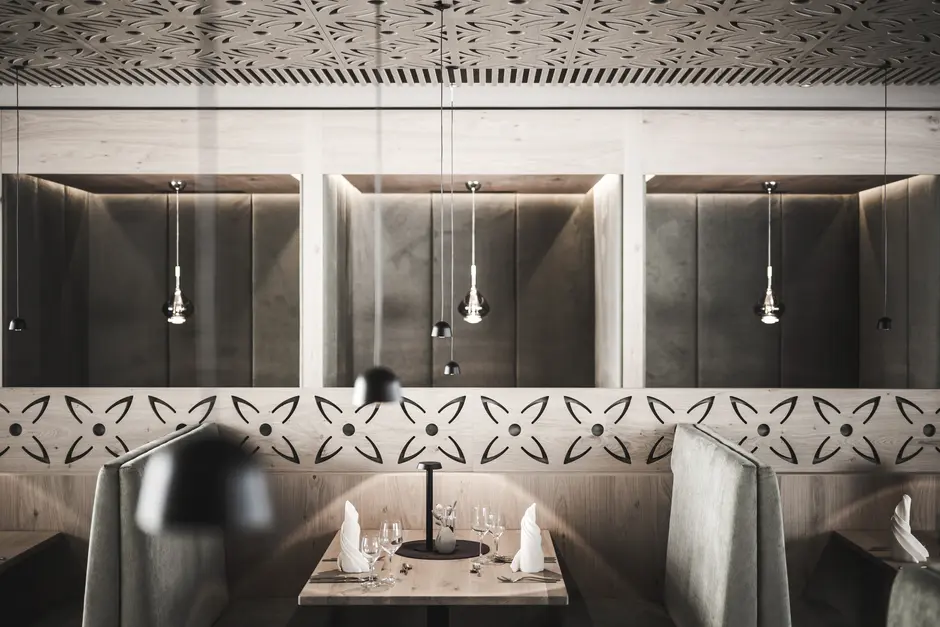 Questo leitmotiv continua nel nuovo design degli interni, dalla hall dell'hotel alla sala da pranzo, dove le nicchie rivestite in pelle invitano gli ospiti a rilassarsi. Anche le camere degli ospiti e l'area benessere sono state rinnovate, con l'aggiunta di nuovi dettagli in alcune aree.