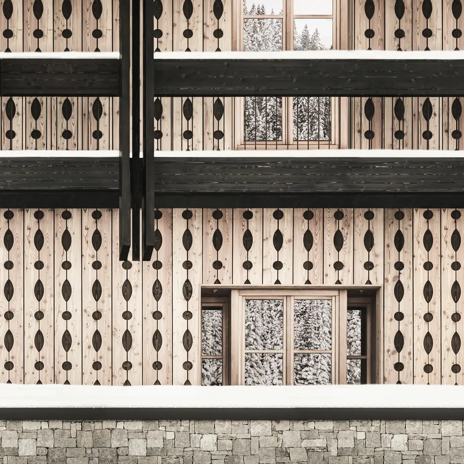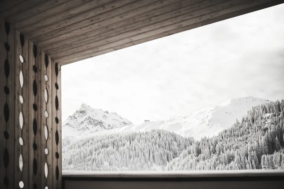 Delicatamente rinnovato: Ispirato dagli eleganti costumi da festa di Montafon con i loro delicati ricami, le logge dei balconi e le facciate sono state rivestite in legno di larice chiaro con un disegno finemente tagliato al laser.