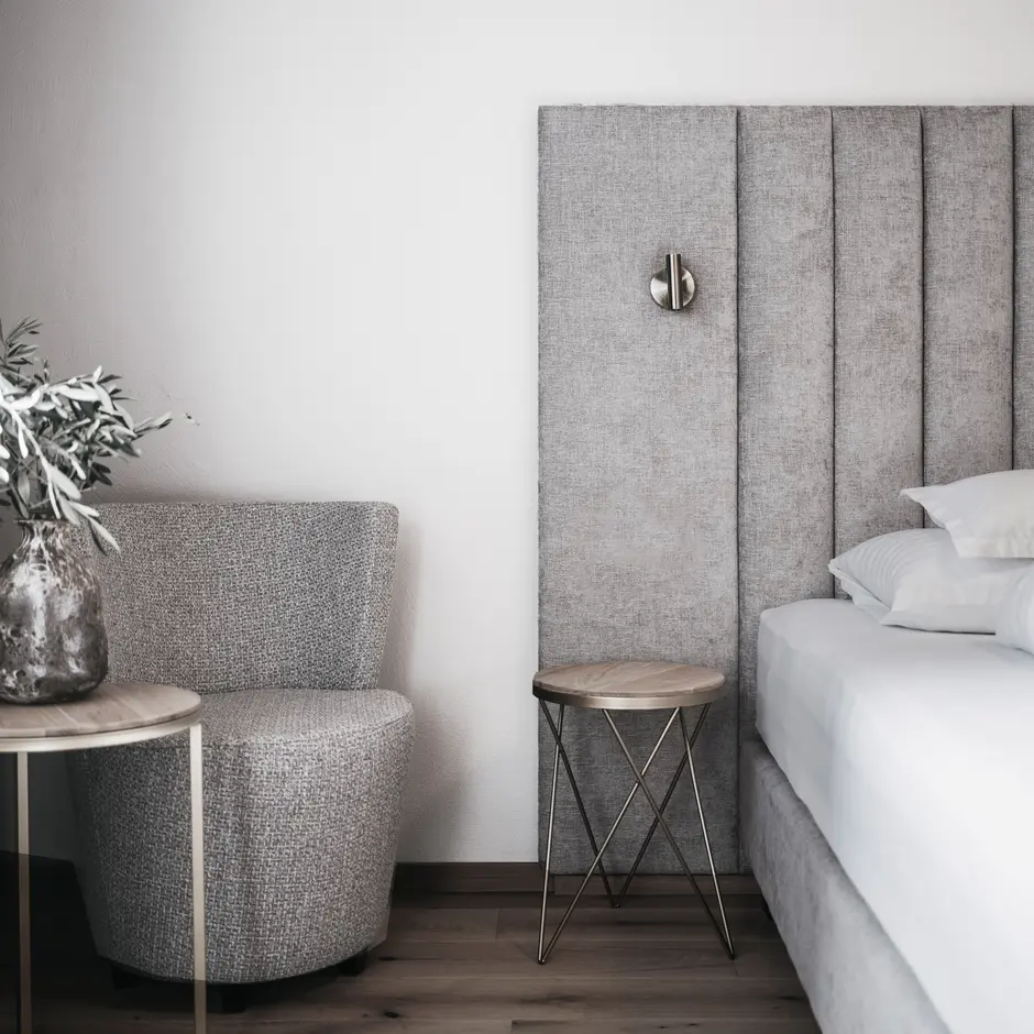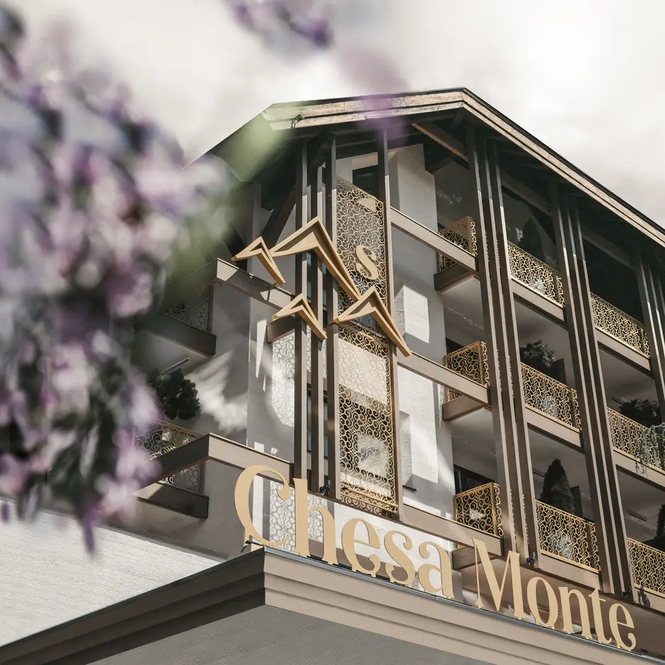 Il restyling della facciata dell'Hotel Chesa Monte di Fiss unisce un intonaco sofisticato in una calda tonalità sabbiosa, lamiere ornamentali tagliate a laser in bronzo chiaro nelle strutture delle ringhiere e lesene verticali in larice spazzolato color tabacco. L'intonaco dello zoccolo con un artistico disegno ornamentale crea un affascinante effetto tridimensionale. L'eleganza senza tempo, abbinata a un nobile rigore e a un forte valore di riconoscimento, definisce l'immagine complessiva. La purezza e la correttezza della struttura a sono di massima importanza, mentre i sottili accenti luminosi sulla facciata creano un effetto affascinante e scultoreo.
