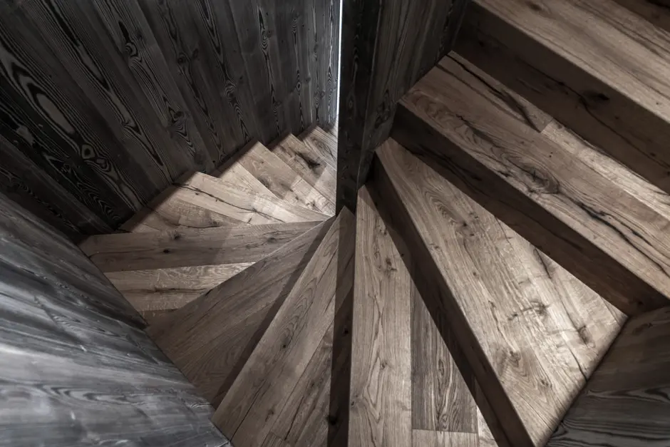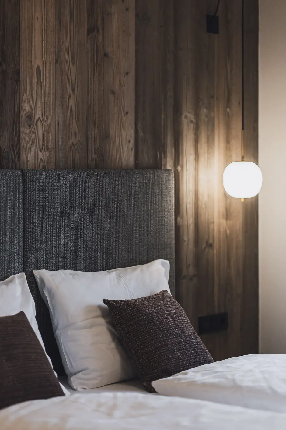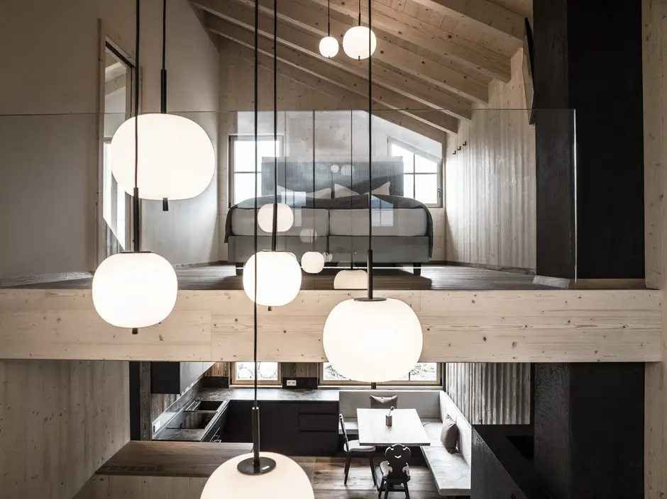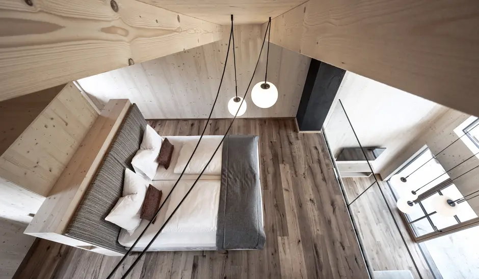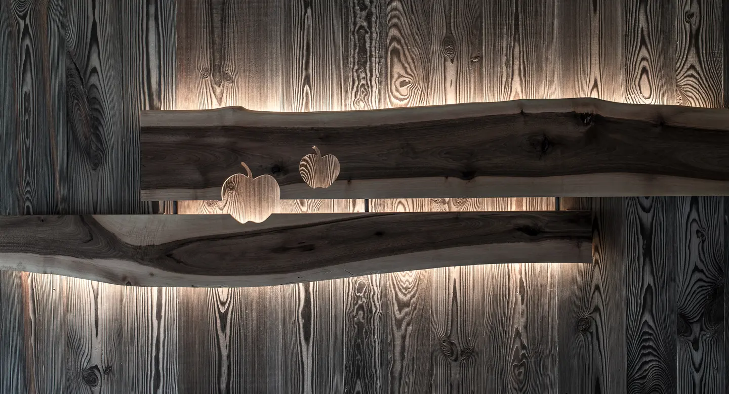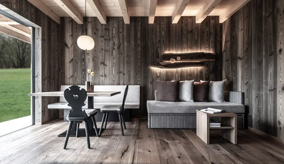 Nel progetto d’interni, legno grezzo di abete e tavole recuperate da vecchi fienili si combinano con dettagli artigianali di alta qualità, creando ambienti caldi e ricchi di carattere, in cui il dialogo tra antico e nuovo è percepibile e coerente. Alcuni appartamenti sono stati rifiniti in larice spazzolato e termotrattato.
