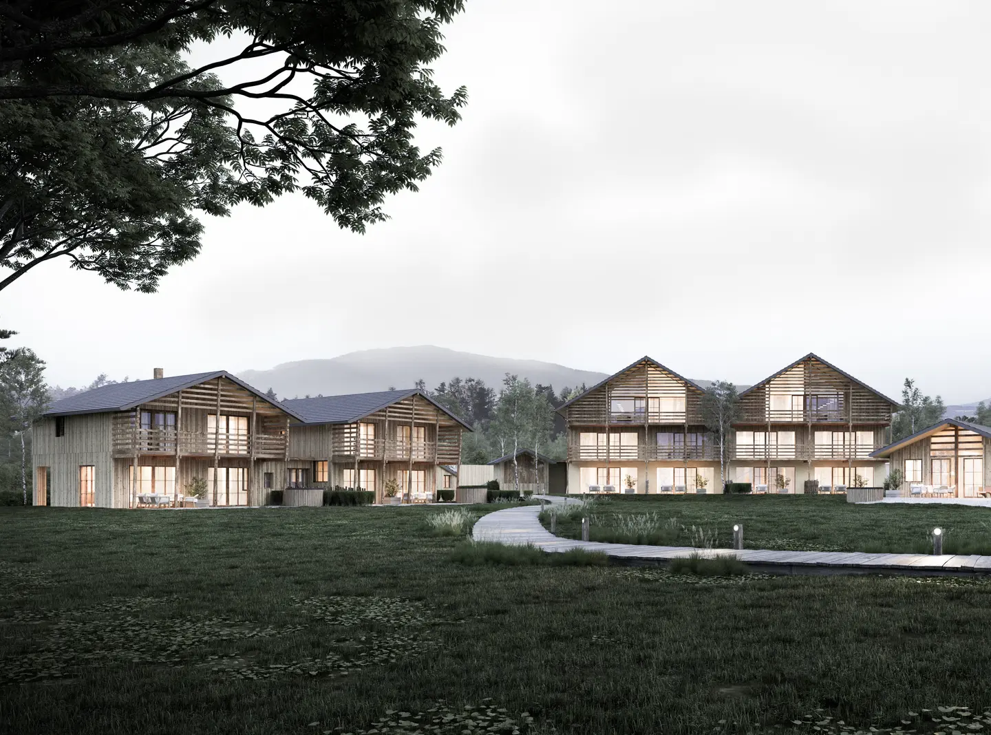 Gli chalet, realizzati in legno come costruzioni autonome, si inseriscono armoniosamente nell’insieme grazie alle proporzioni e all’orientamento. Due edifici sono leggermente sfalsati e uniti da un corpo basso intermedio, creando un'immagine armoniosa e articolata dal punto di vista morfologico. Ogni chalet, arredato con cura e dotato di comfort elevati, dispone di spazi wellness privati con sauna, vasca esterna riscaldata e, in alcuni casi, vasca da bagno freestanding – un vero rifugio di benessere e intimità.