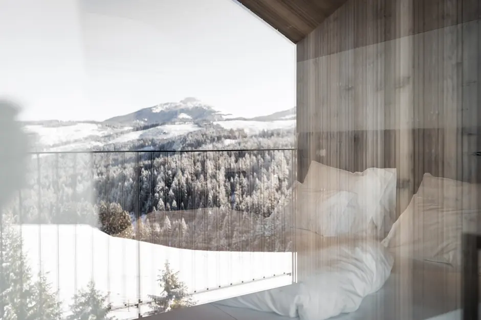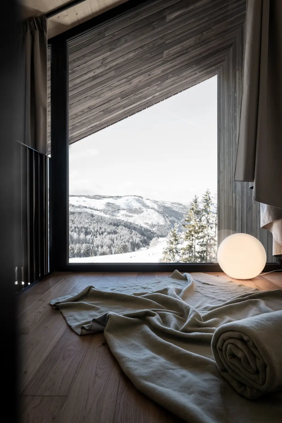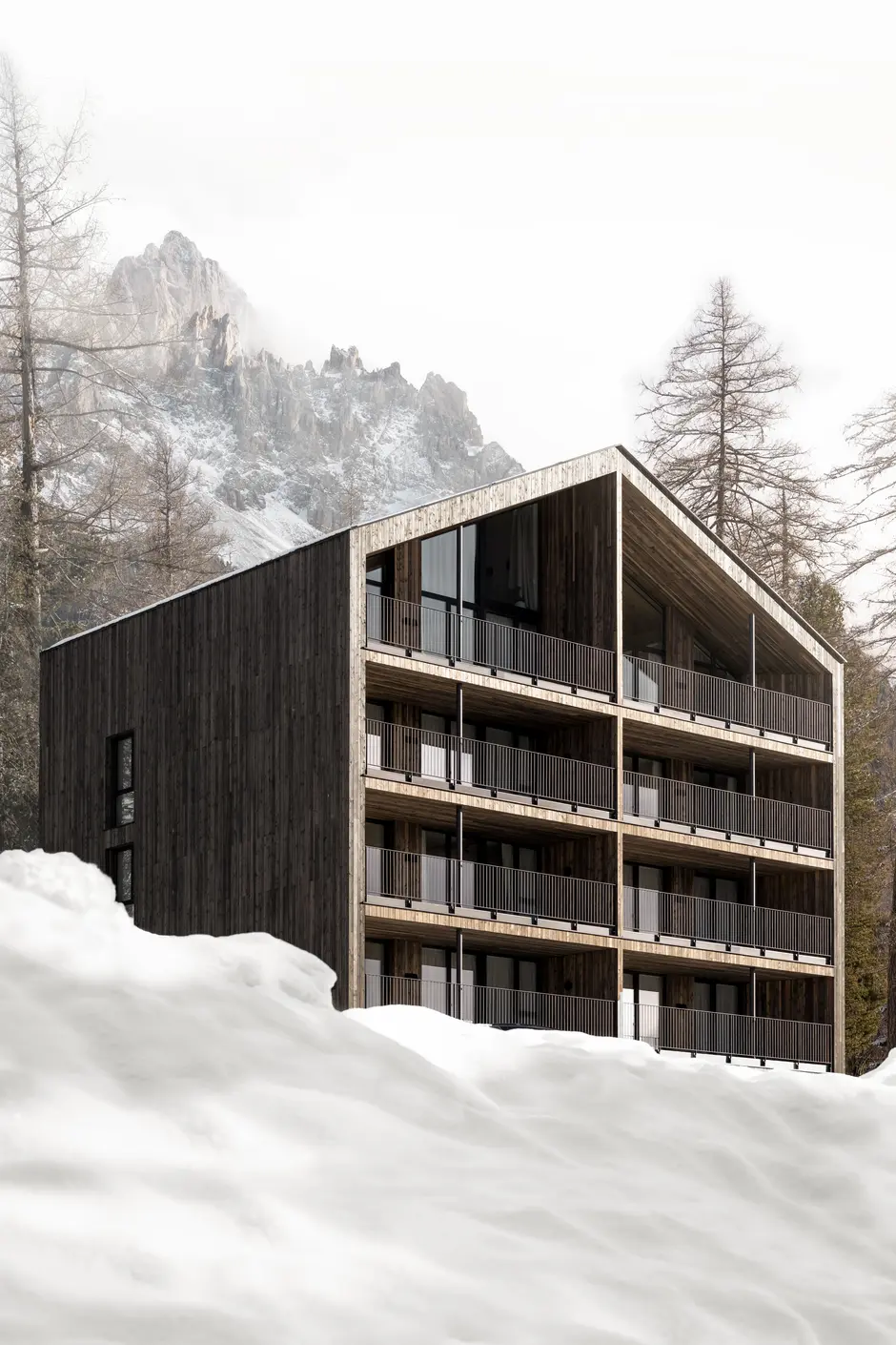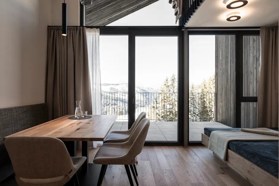 La vetrata a tutta altezza e la loggia antistante caratterizzano l’esperienza abitativa di ogni unità: la natura entra nello spazio interno, la luce scandisce il tempo, mentre la loggia garantisce riservatezza ed estende visivamente l’ambiente verso l’esterno. Una composizione delicata tra trasparenza e intimità – per vivere al ritmo della montagna.