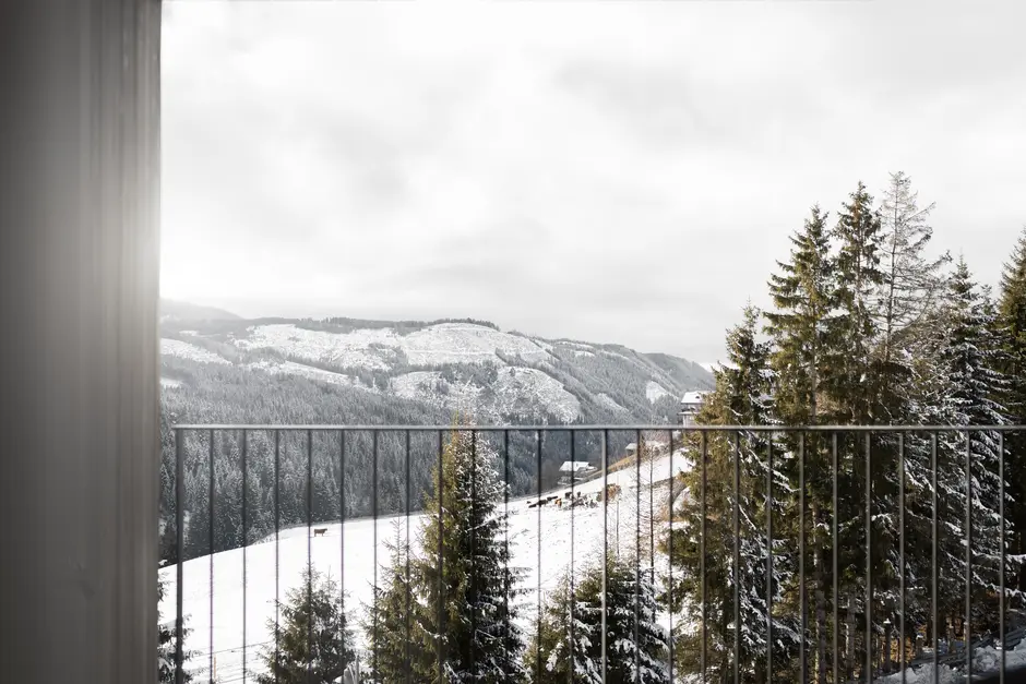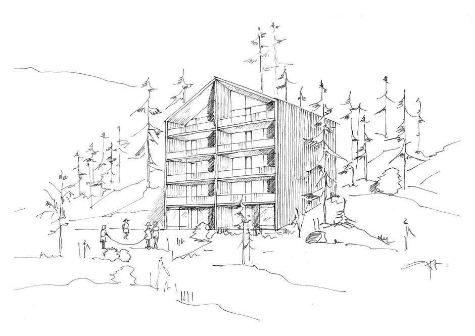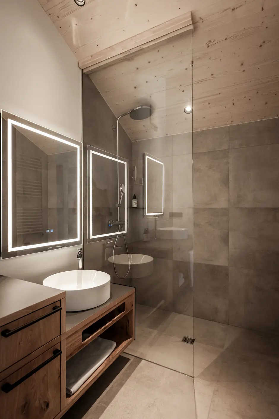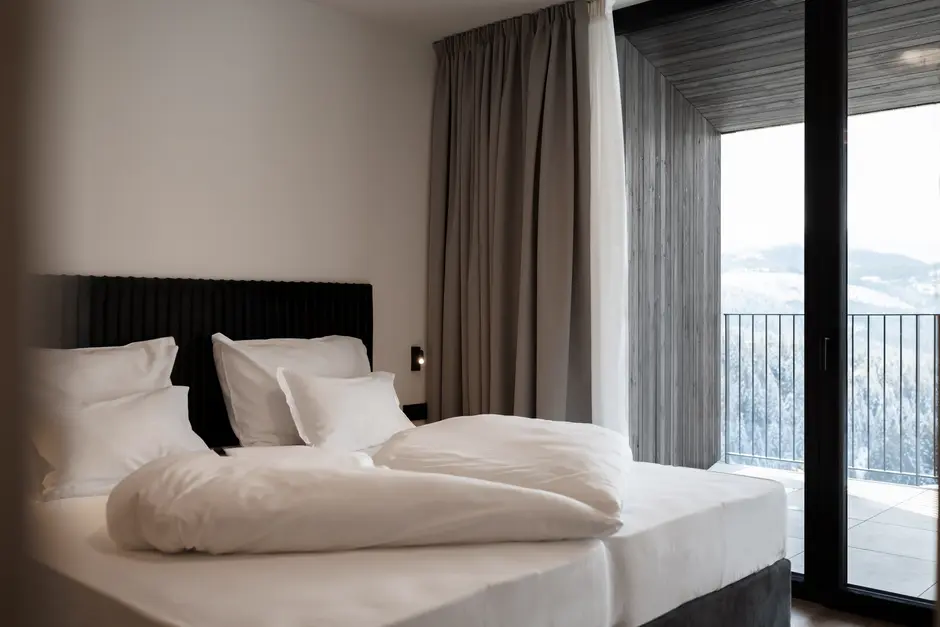 La vetrata a tutta altezza e la loggia antistante caratterizzano l’esperienza abitativa di ogni unità: la natura entra nello spazio interno, la luce scandisce il tempo, mentre la loggia garantisce riservatezza ed estende visivamente l’ambiente verso l’esterno. Una composizione delicata tra trasparenza e intimità – per vivere al ritmo della montagna.