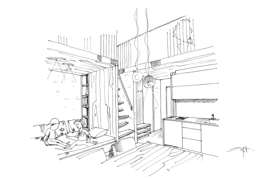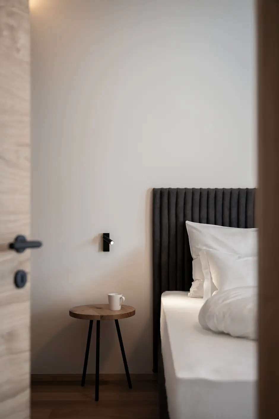All’interno, la sobrietà formale incontra materiali caldi e tattili: superfici in legno oliato, tessuti naturali e una luce dosata con cura generano un’atmosfera di quiete e accoglienza – pensata per adulti e bambini allo stesso modo.