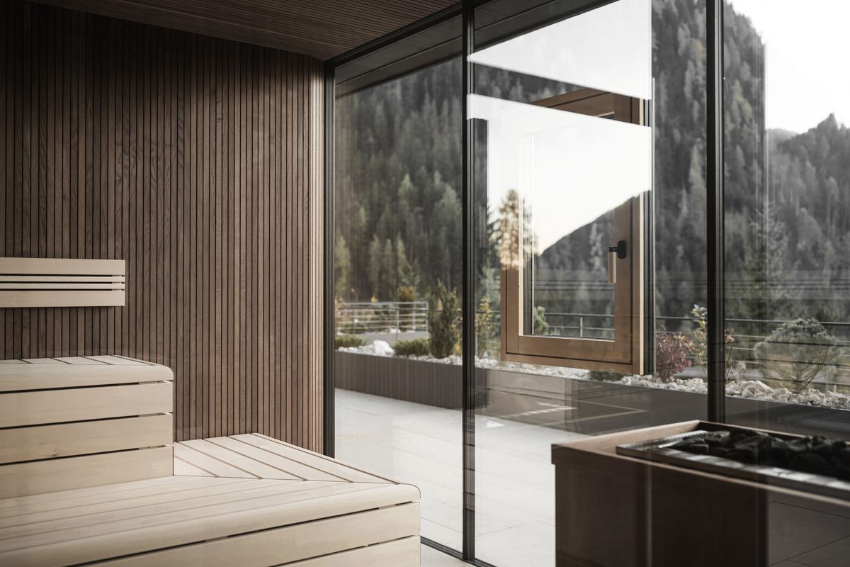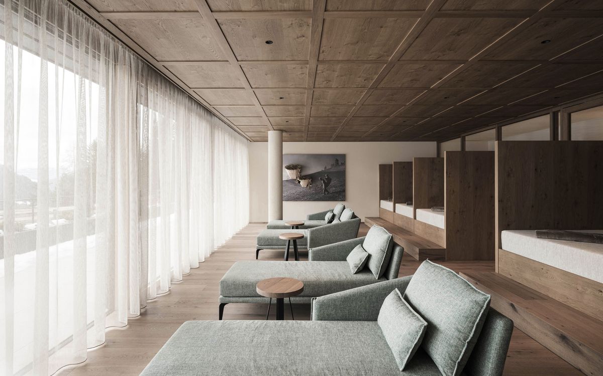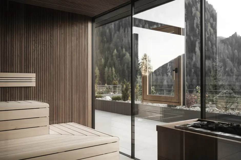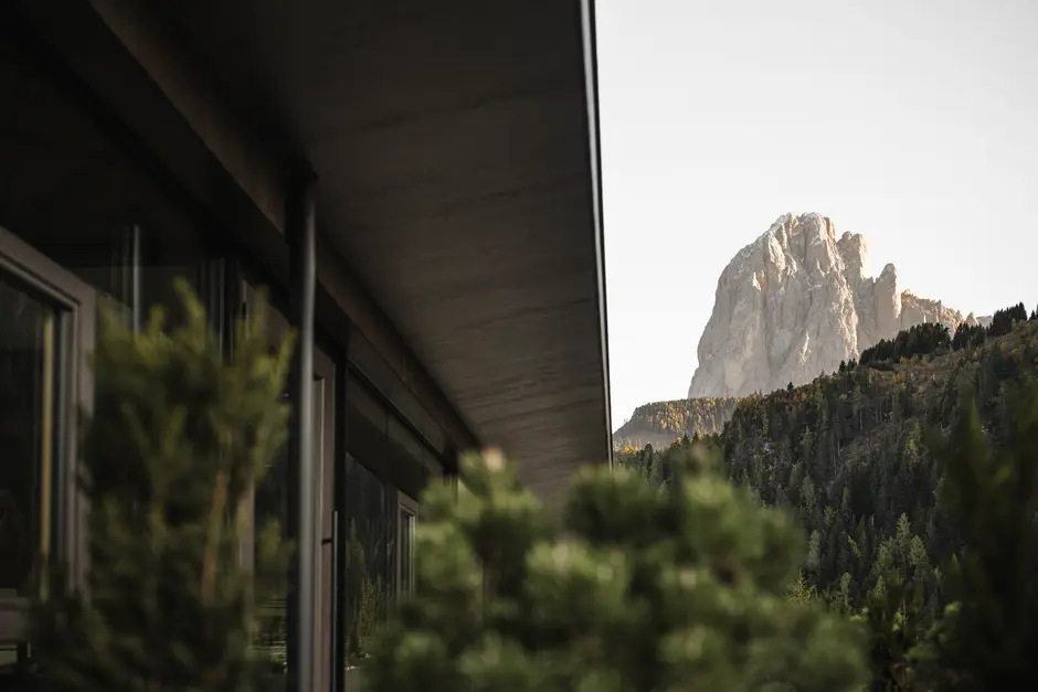 Generose aperture collegano gli spazi interni con il paesaggio montano della Val Gardena, rendendo la natura parte integrante dell’esperienza.