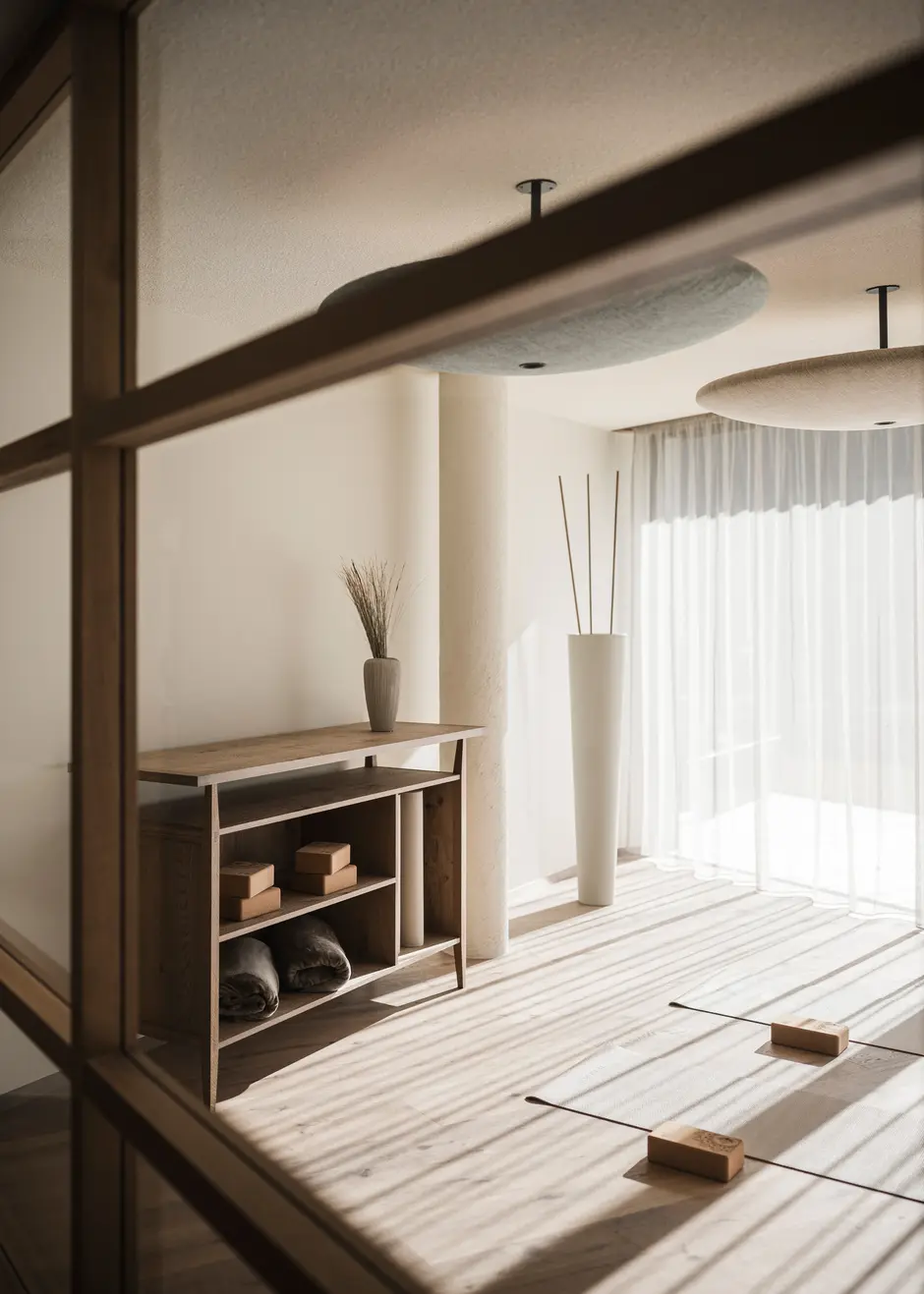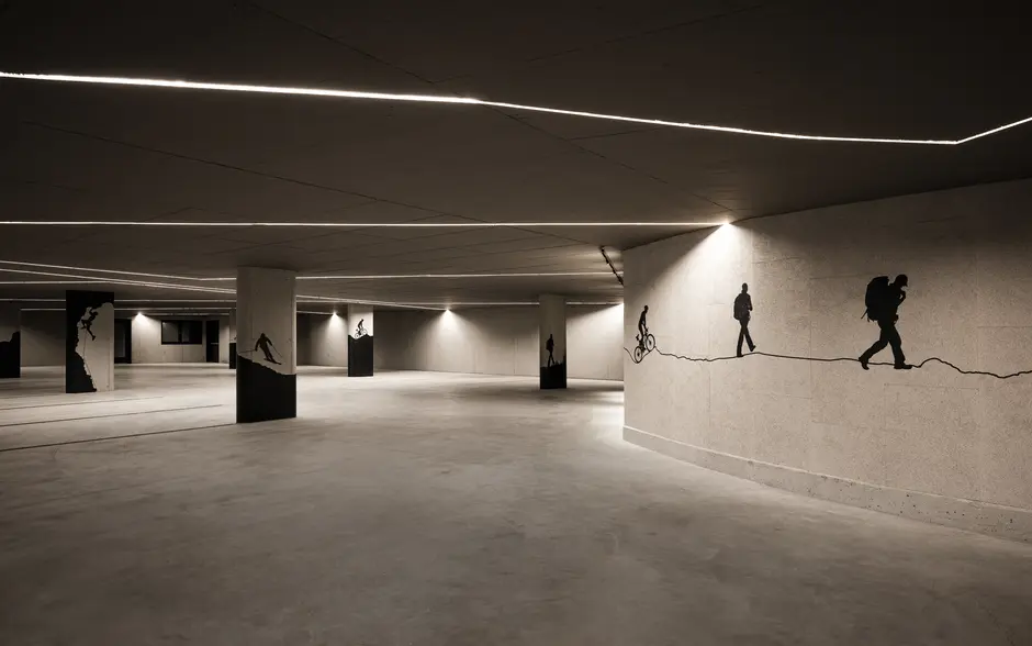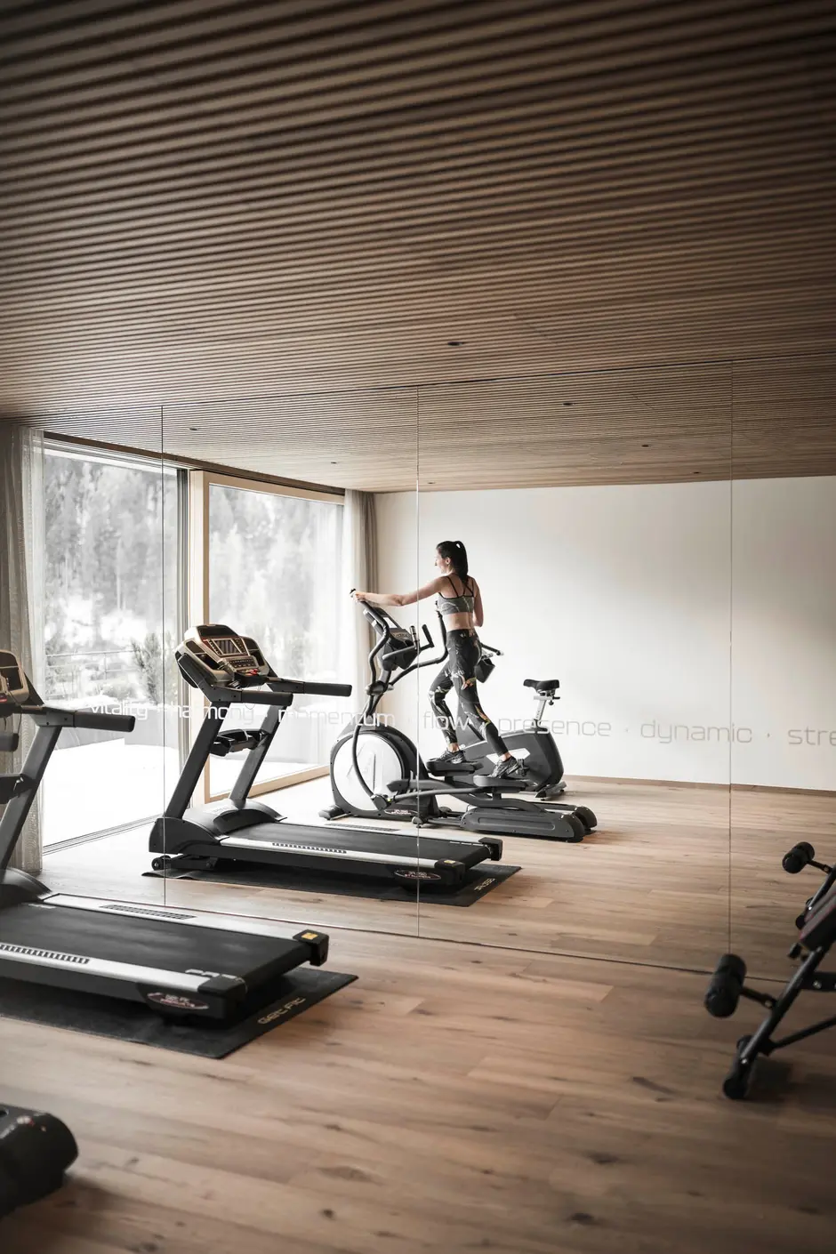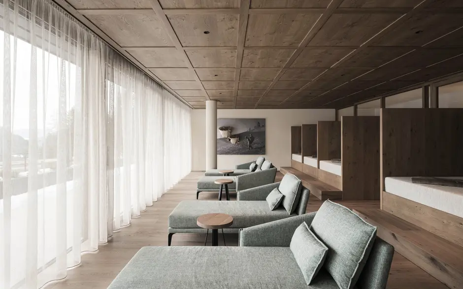 La nuova area yoga, spa e fitness della Sovara Sportresidence è concepita come una sequenza di ambienti tranquilli. Sala yoga, sala fitness, saune e zone relax formano una coreografia architettonica tra movimento, calore e silenzio.