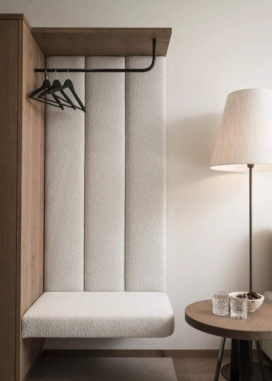 Materiali naturali come legno massiccio, intonaco acustico ed elementi tessili caratterizzano l’atmosfera.