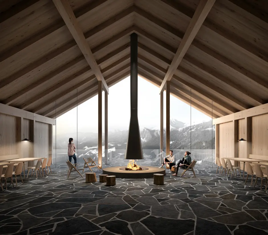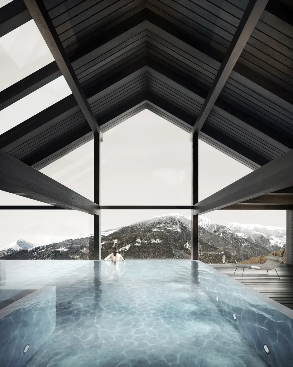 Gli interni riflettono un’estetica sobria e materica: materiali naturali – come il legno, il porfido sarentino e tessuti locali in lino, lana cotta e feltro – definiscono un’atmosfera calda, accogliente e silenziosa. Le tre tipologie di appartamento garantiscono flessibilità e comfort, ciascuna con un’area esterna privata a diretto contatto con la natura. Gli spazi comuni – reception, lounge, bar e ristorante – sono concepiti come ambienti fluidi e luminosi, in cui il paesaggio diventa parte integrante dell’esperienza abitativa.