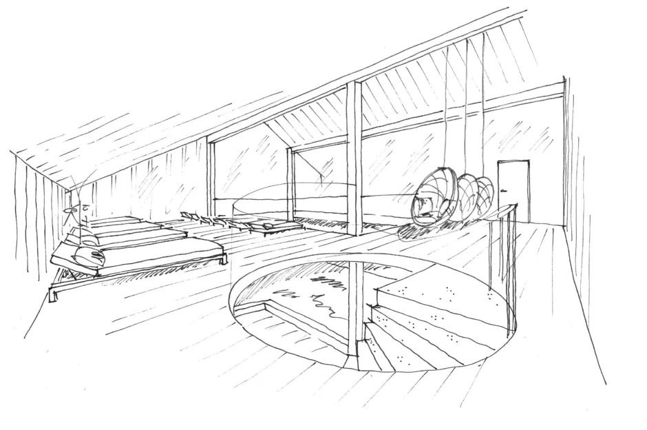 Un centro wellness con piscina, saune e aree relax completa l’offerta. L’accesso avviene tramite un discreto collegamento sotterraneo, che consente agli ospiti di raggiungere direttamente la struttura, lasciando la superficie libera da veicoli e preservando la centralità della natura.