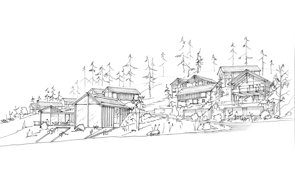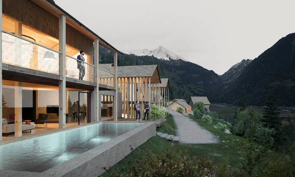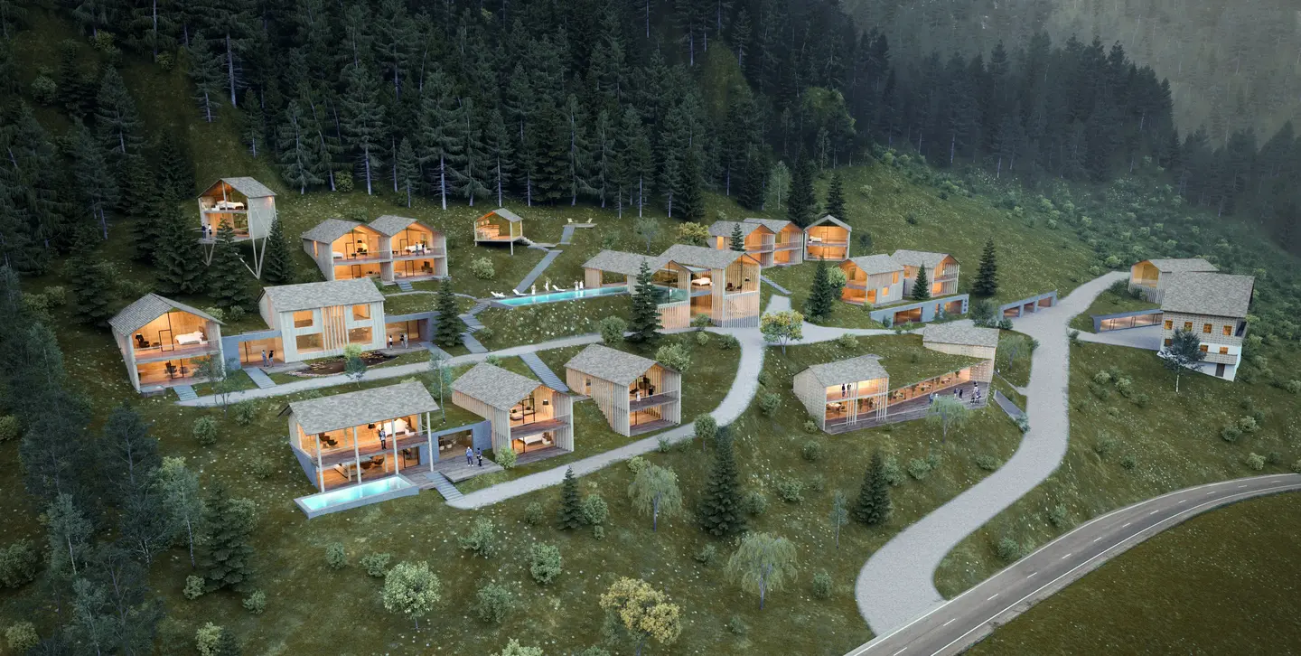 Adagiato su un soleggiato pendio fiorito, ai margini del bosco alpino, nasce un villaggio di chalet che fonde natura, architettura e benessere in un dialogo armonioso. Gli chalet, costruiti in legno e vetro secondo un linguaggio architettonico contemporaneo e discreto, sono disposti in modo sfalsato lungo il pendio, garantendo a ciascuna unità vista aperta e massima privacy. I tetti a due falde, rivestiti di scandole in larice grigio argento, richiamano la tradizione edilizia locale.