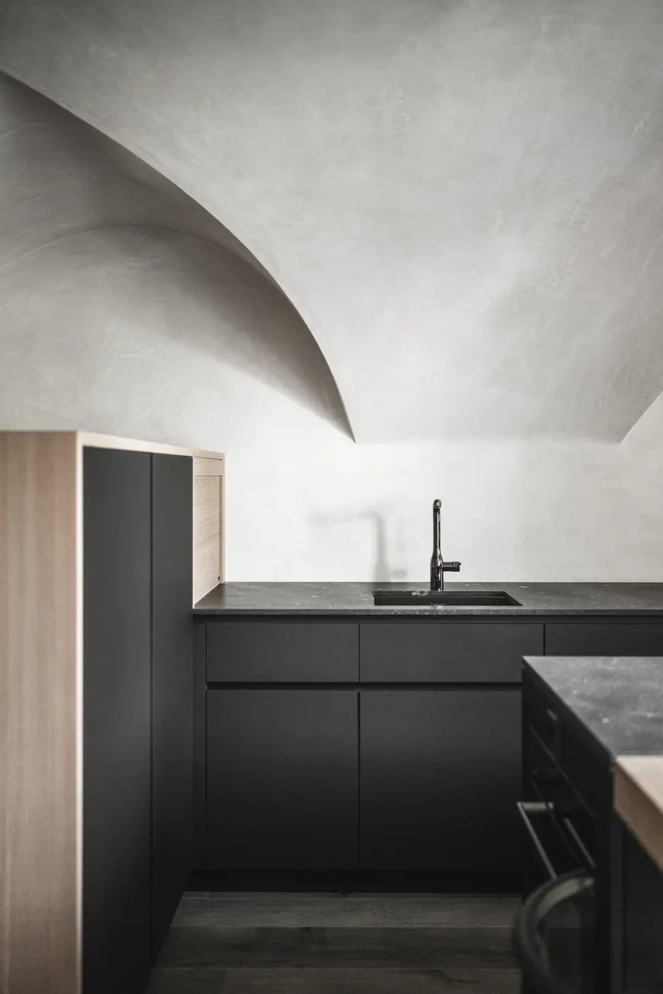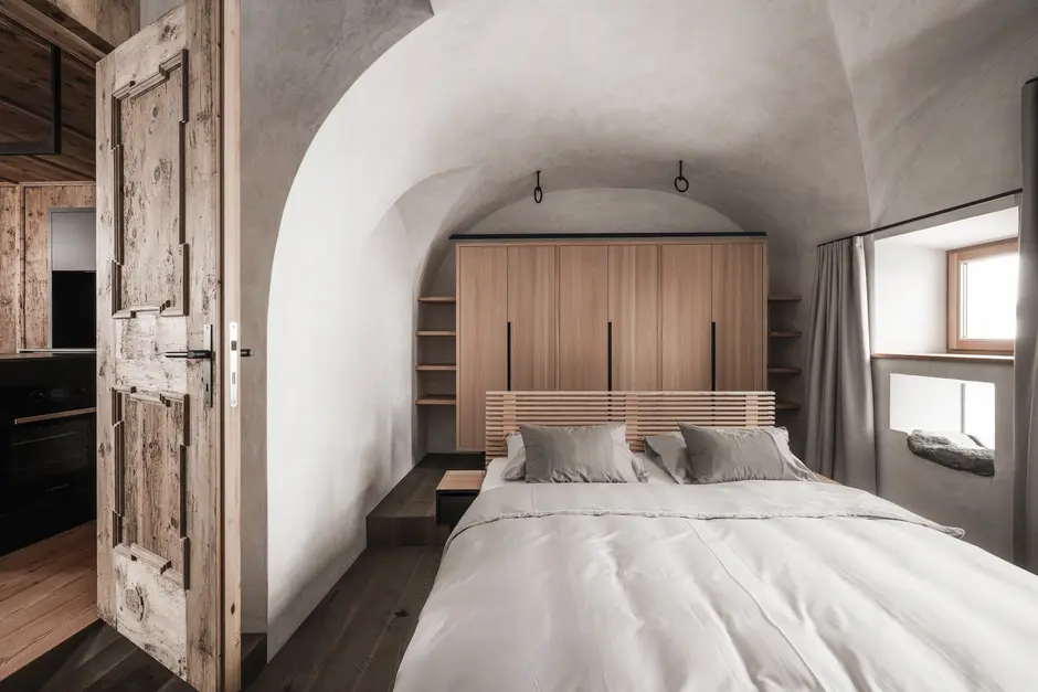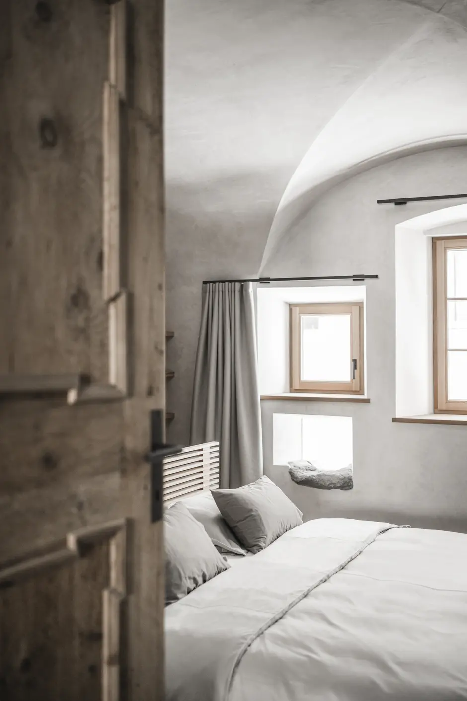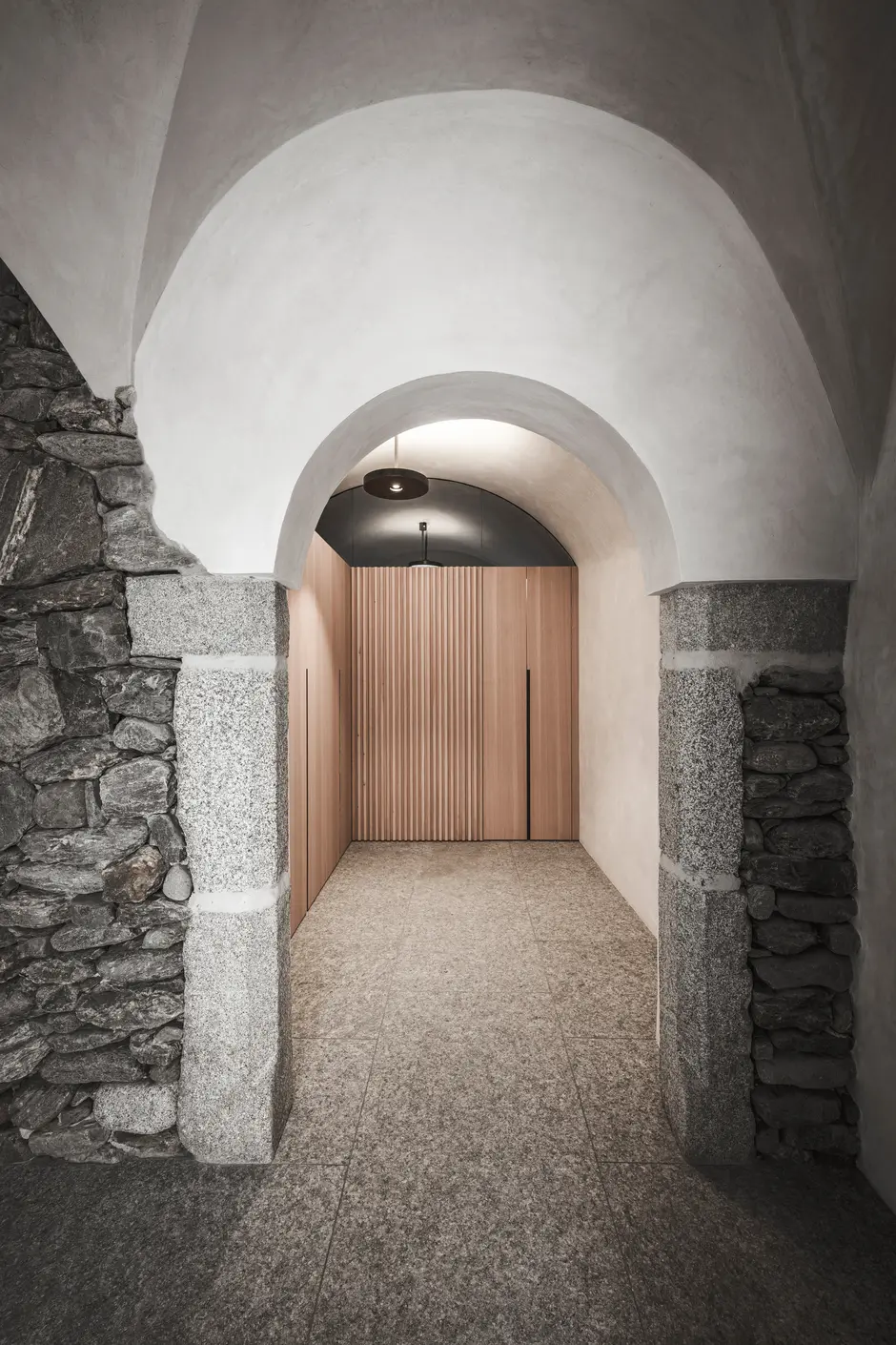 Il principio guida è stato quello della misura: non volere troppo, ma esercitare la disciplina del trattenersi. Così, l’intervento si trasforma in un equilibrio sottile tra rispetto della storia e audace reinterpretazione. Molti elementi originari – volte, murature in pietra naturale, solai lignei – sono stati conservati. Tutto ciò che non era sottoposto a vincoli e disturbava la purezza spaziale è stato rimosso: l’essenziale è stato riportato alla luce. Tracce antiche, come una porta alta appena 1,70 metri, sono state volutamente mantenute – silenziosi testimoni di una cultura abitativa ormai scomparsa.