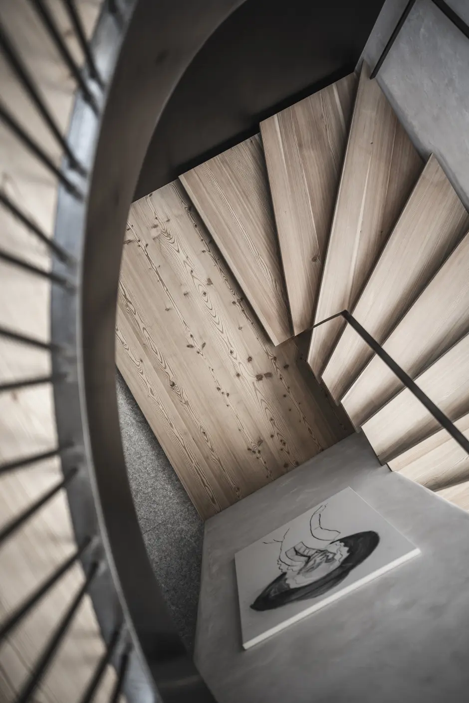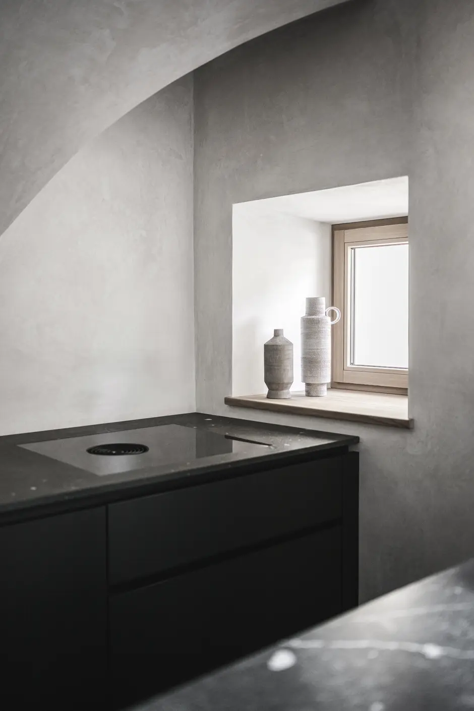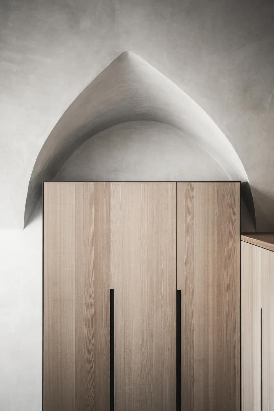 Il principio guida è stato quello della misura: non volere troppo, ma esercitare la disciplina del trattenersi. Così, l’intervento si trasforma in un equilibrio sottile tra rispetto della storia e audace reinterpretazione. Molti elementi originari – volte, murature in pietra naturale, solai lignei – sono stati conservati. Tutto ciò che non era sottoposto a vincoli e disturbava la purezza spaziale è stato rimosso: l’essenziale è stato riportato alla luce. Tracce antiche, come una porta alta appena 1,70 metri, sono state volutamente mantenute – silenziosi testimoni di una cultura abitativa ormai scomparsa.