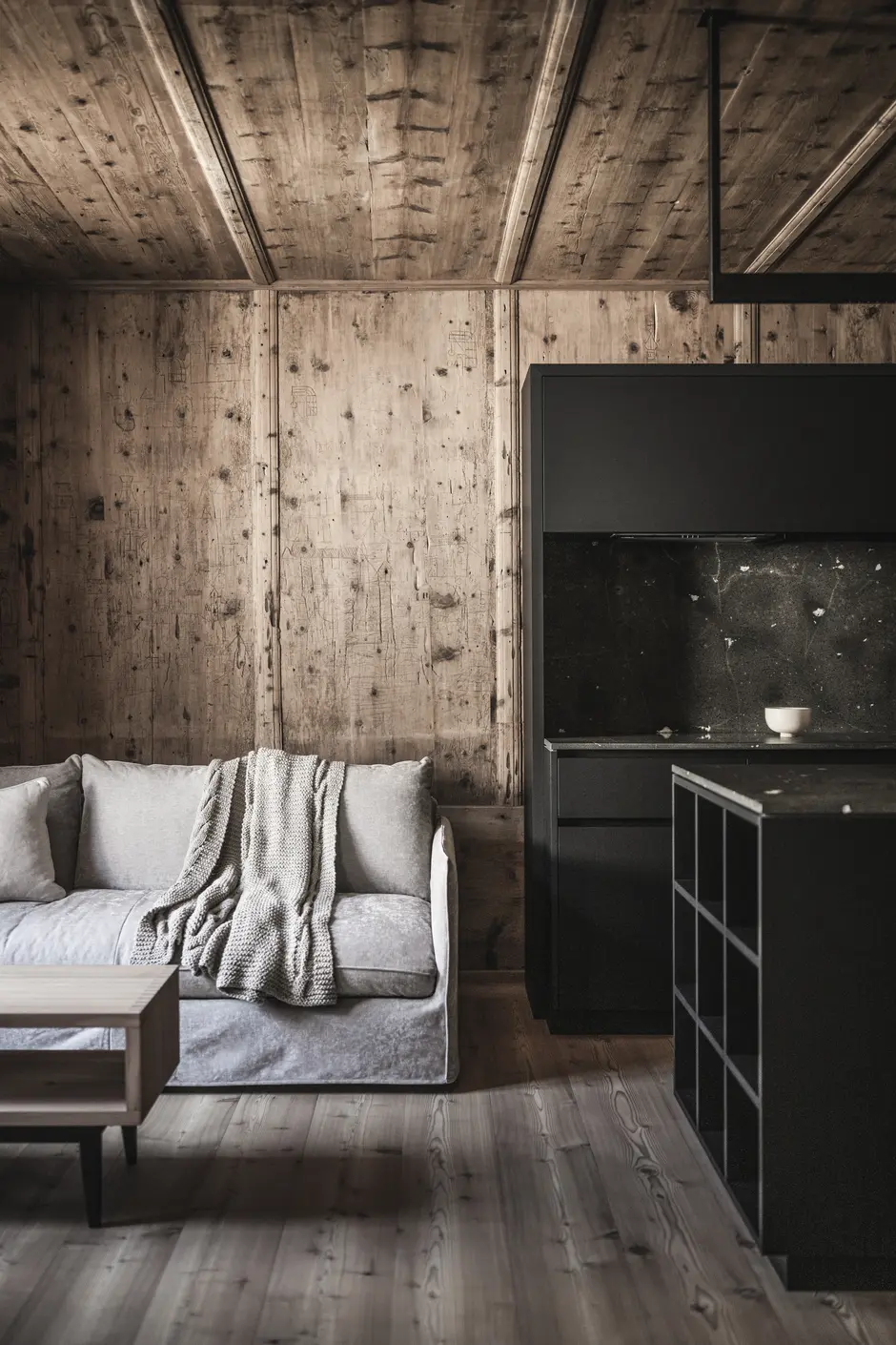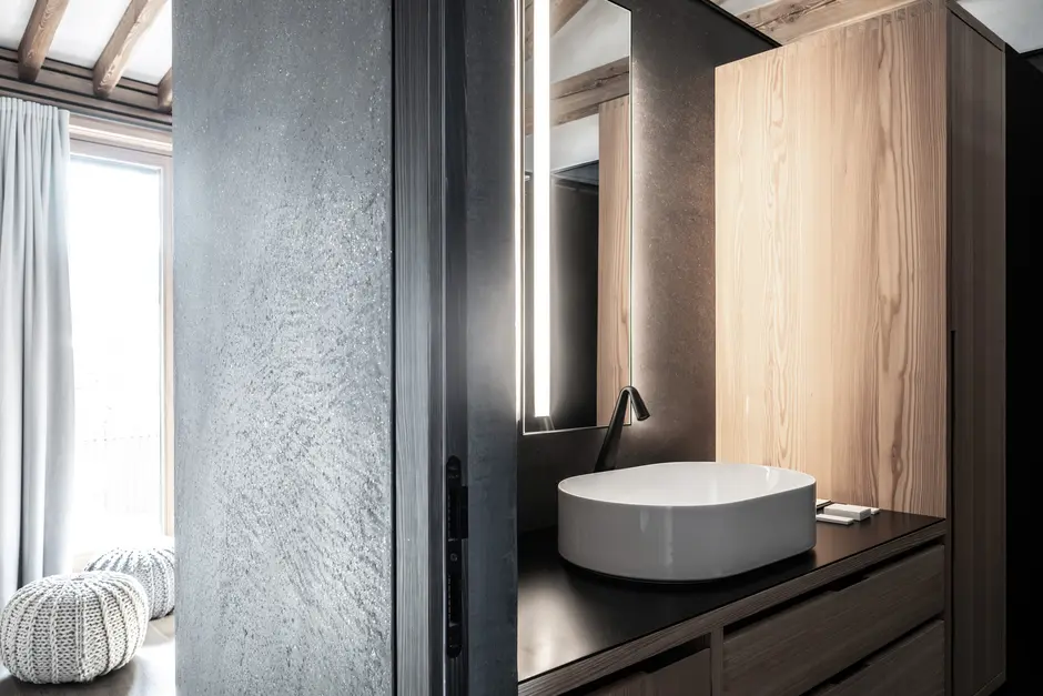 Oggi il Tintorum accoglie quattro appartamenti fuori dal comune, che fondono comfort contemporaneo e storia visibile. La distribuzione degli spazi segue una drammaturgia aperta: cucina abitabile, zone notte e spazi di ritiro si fondono in paesaggi luminosi, dove elementi originari come le pareti in pietra o i soffitti con travi a vista dettano il carattere. L’arredo è sobrio, spesso integrato, talvolta reversibile. I materiali sono locali, autentici, sensoriali: larice spazzolato, cemento a vista nei bagni, tonalità neutre e avvolgenti.