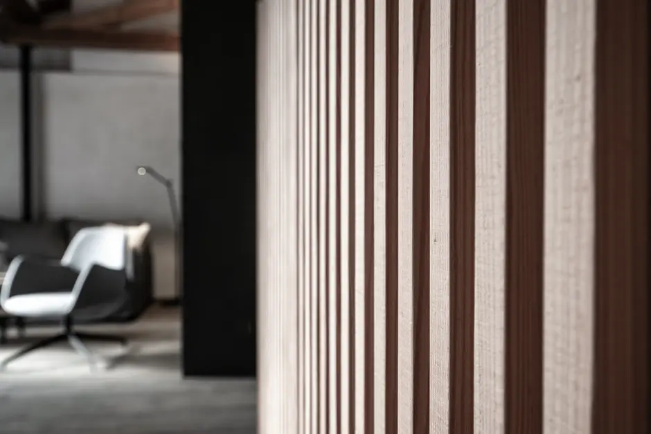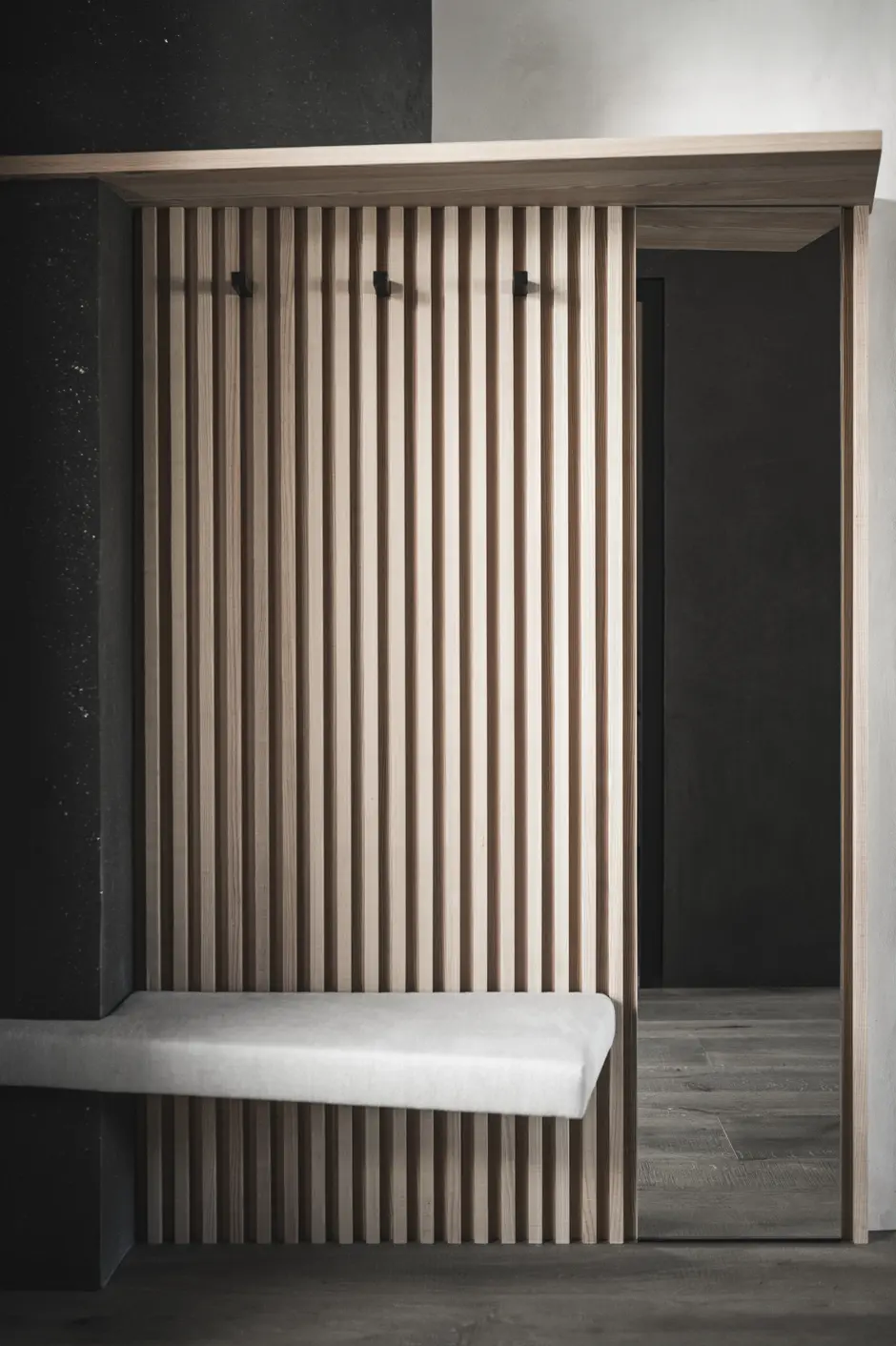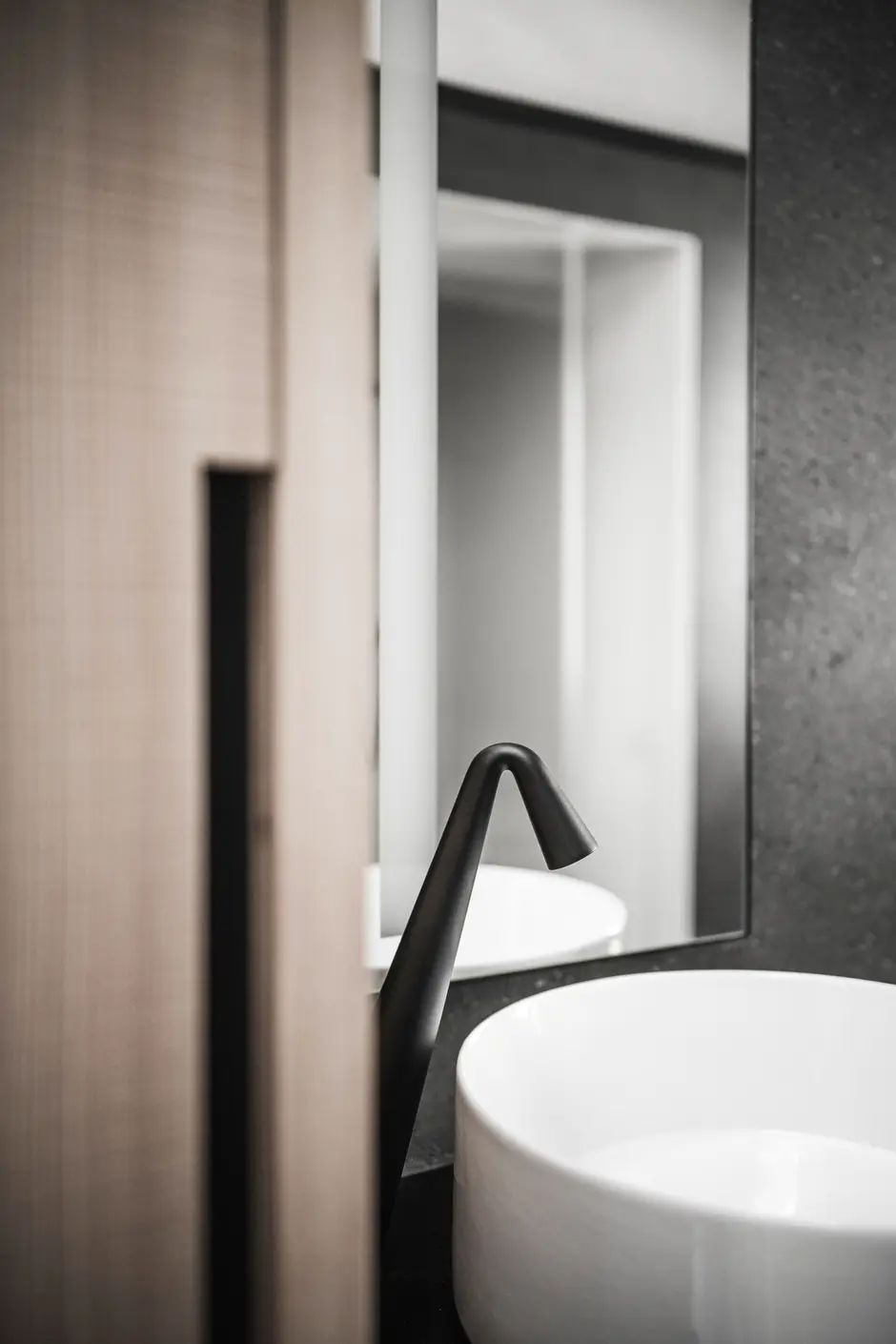 Gli nuovi interventi architettonici si pongono con discrezione: pareti attrezzate, arredi fissi e partizioni vetrate si inseriscono nello spazio come “impianti” – in dialogo rispettoso con l’esistente. Nessuna invasione della sostanza storica, nessuna prevaricazione del nuovo. Legno, vetro e acciaio accompagnano con eleganza sommessa, mai in competizione.