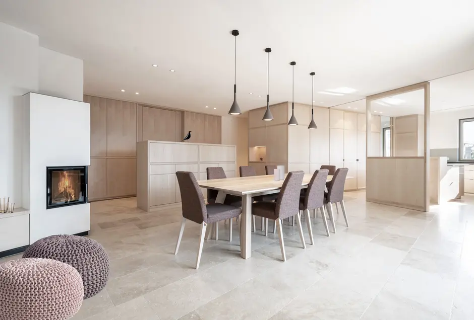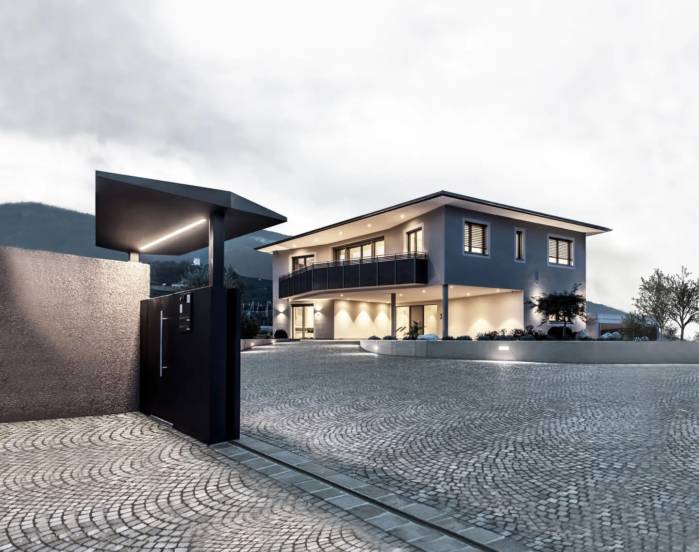 Nel villaggio vinicolo di Appiano, in posizione centrale su un terreno leggermente in pendenza che si inserisce in modo discreto nel paesaggio locale, è stata costruita una piccola villa contemporanea. La costruzione è solida, con due piani residenziali in muratura, intonacati esternamente in grigio-beige. Le finestre sono incorniciate da un intonaco fine di colore chiaro contrastante. Il tetto a capanna, tipico del luogo, è stato coperto con le tradizionali tegole di argilla coppi. Nel design degli interni sono stati utilizzati pochi materiali armoniosi, tra cui il legno di betulla nodoso e la pietra di travertino, per un elevato grado di accoglienza.