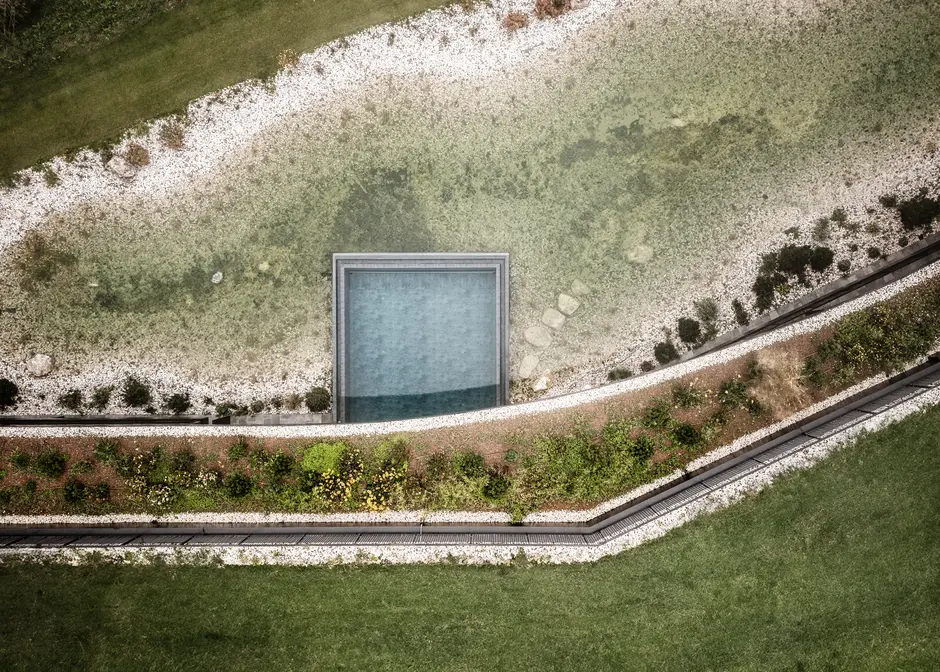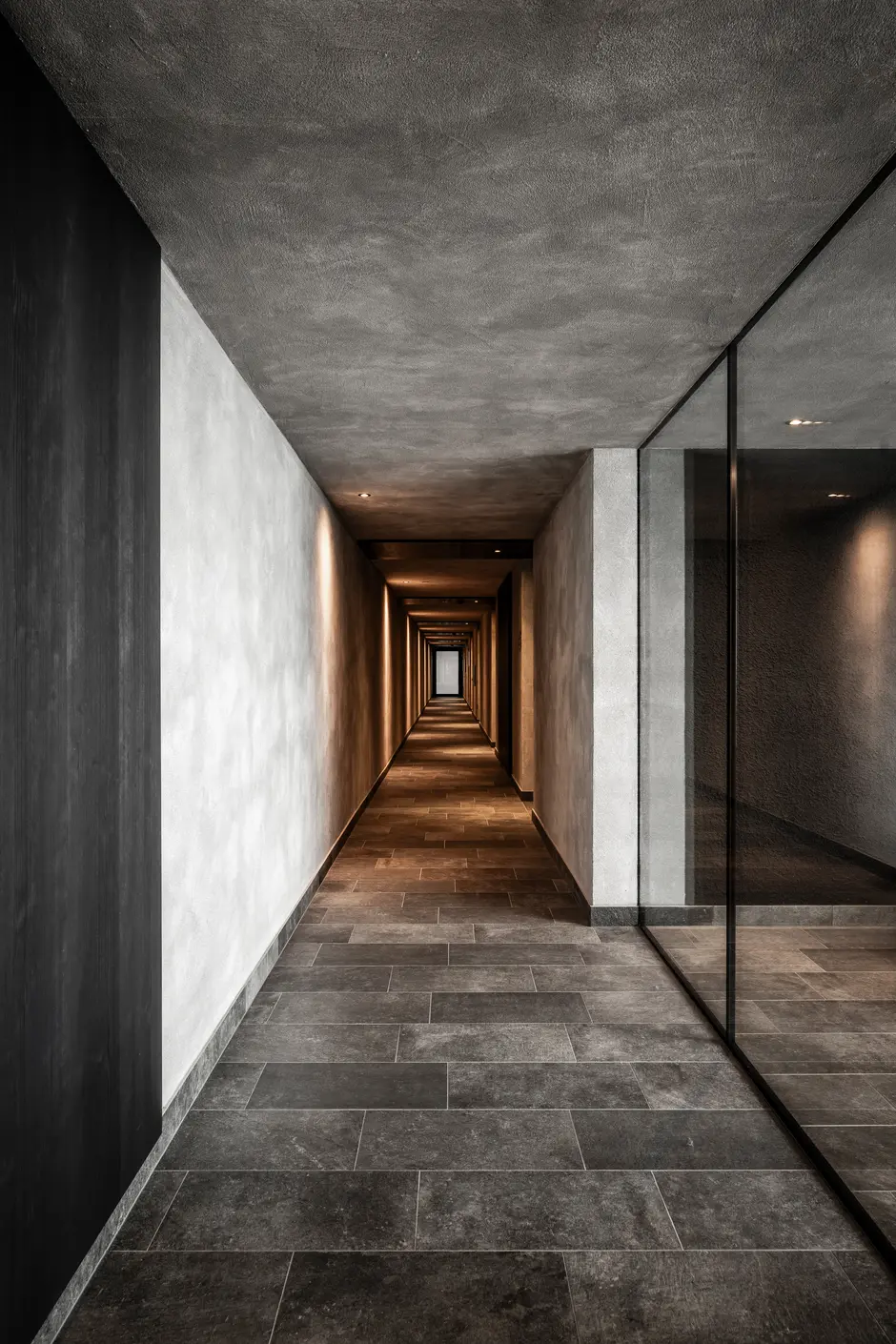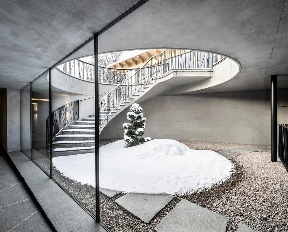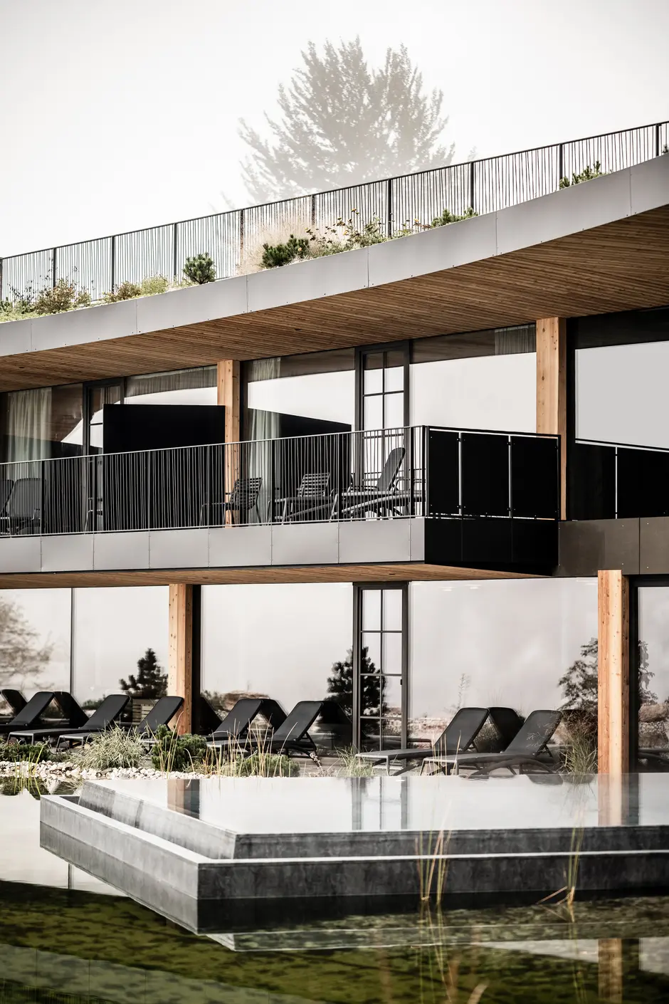 Die Materialwahl ist bewusst ehrlich: Lärchenholz, das mit der Witterung reift; Sichtbeton, der Ruhe und Beständigkeit ausstrahlt; Glas, das Transparenz und Landschaft vermittelt. Die Architektur antwortet nicht auf Trends, sondern auf den Ort – mit Zurückhaltung, Würde und Weitblick.