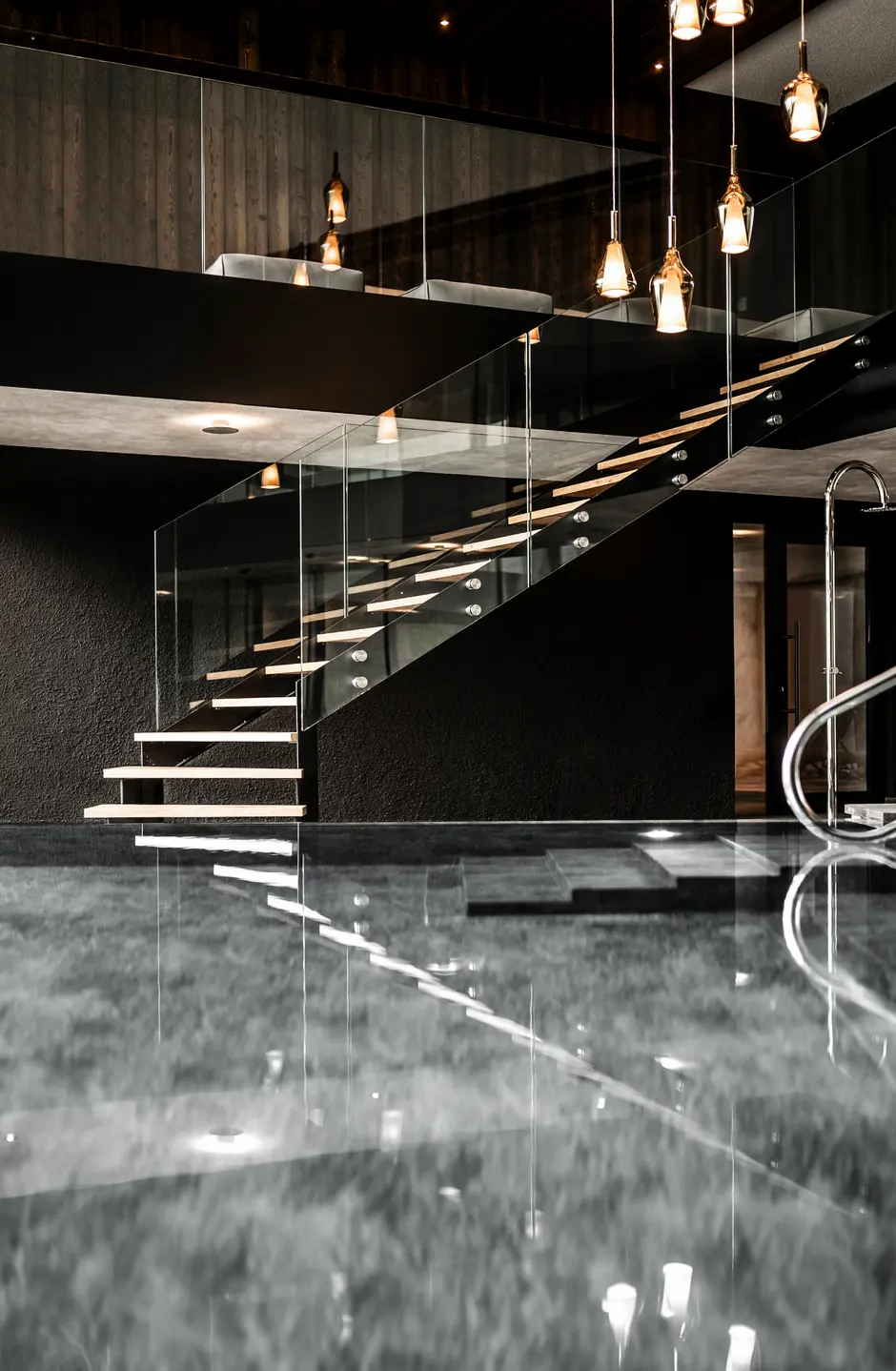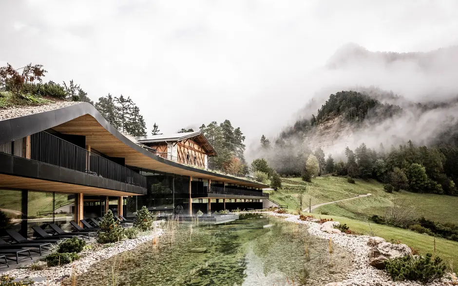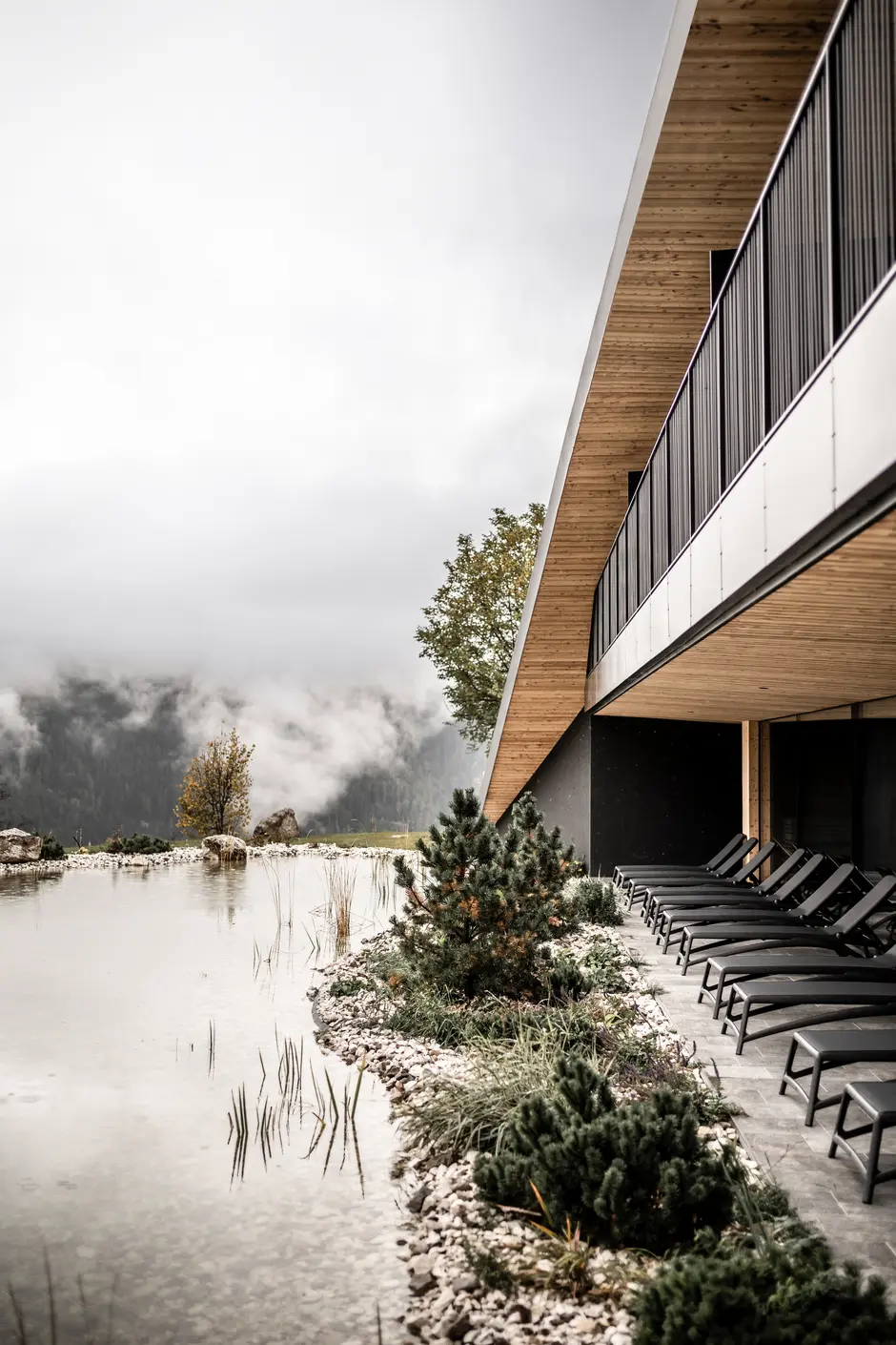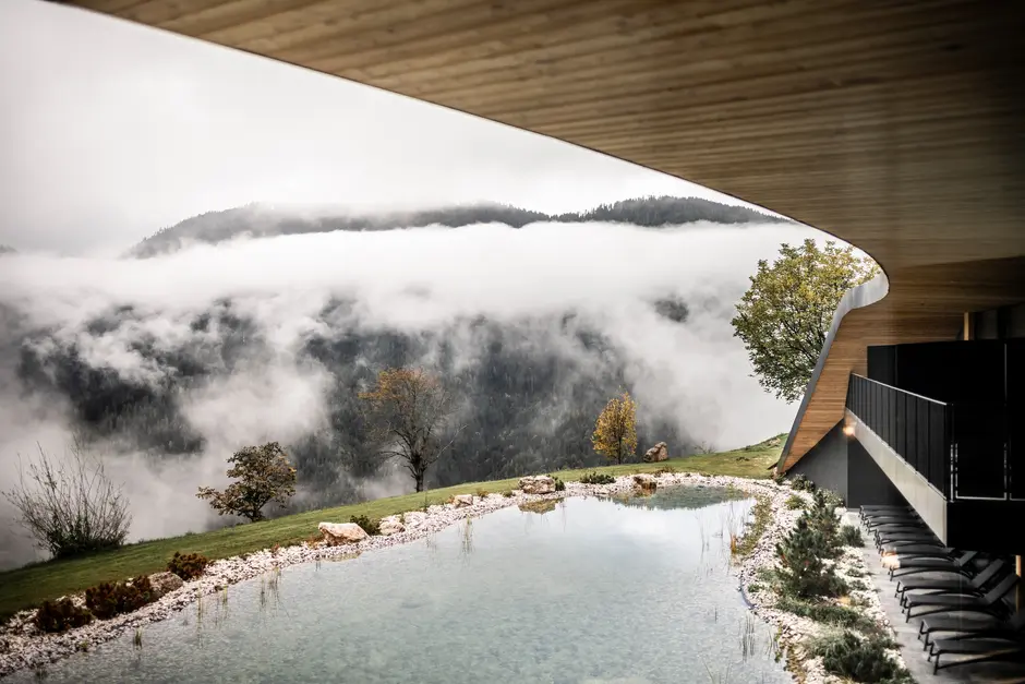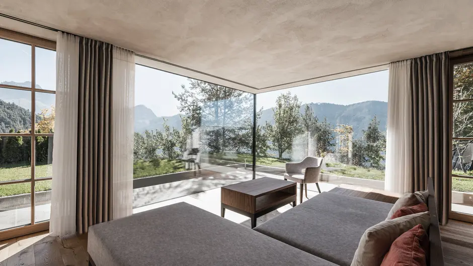 Im Inneren eröffnet sich ein neues Raumgefühl: lichtdurchflutete Speisesäle, ein behutsam neu interpretiertes Restaurant und ein Wellnessbereich mit Schwimmbad schaffen Orte des Innehaltens. Über große Fensterflächen werden Berge und Himmel Teil des Erlebens, ohne aufdringlich zu sein – wie das Haus selbst.
