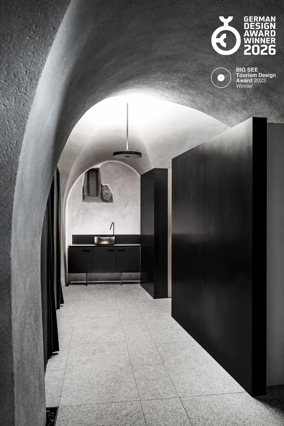 Der finstere Gewölbekeller wurde zu einem modernen Schönheitsstudio ausgebaut. Funktionsbedingte Einbauelemente aus Schwarzstahl fügen sich diskret ein und setzen zeitgenössische architektonische Akzente.