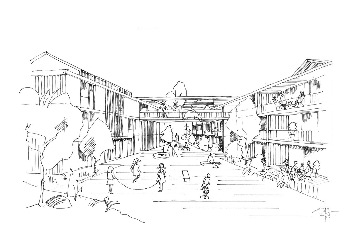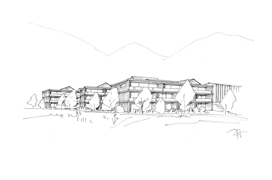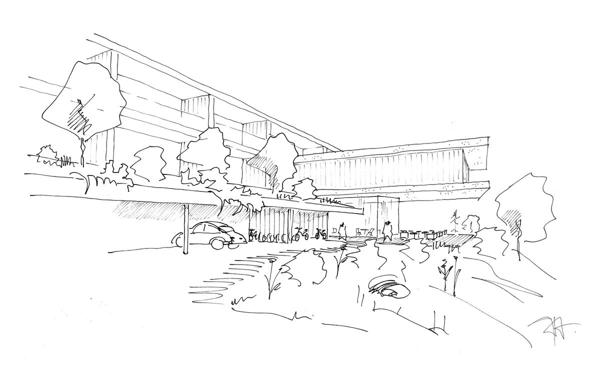 Die einzelnen Bauvolumen sind als schlichte, horizontale Riegel konzipiert, die sich selbstverständlich in das Gelände einfügen. Durch Lichthöfe, Freiräume und klar strukturierte Erschließungselemente werden die Baukörper rhythmisch gegliedert.