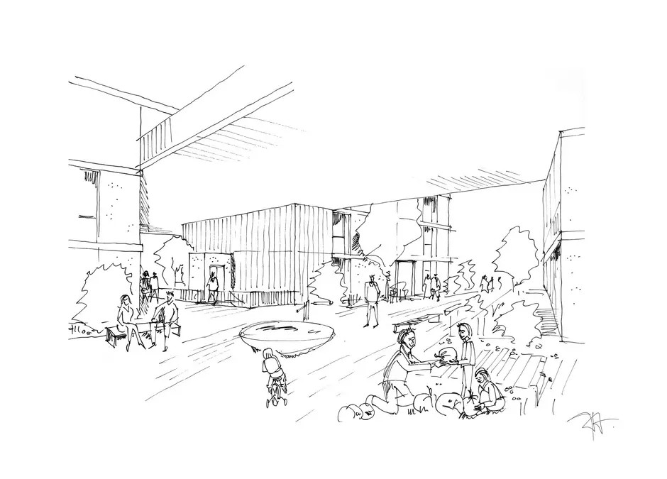 Diese Gliederung schafft nicht nur Orientierung, sondern auch eine Abfolge differenzierter Außen- und Zwischenräume, die Begegnung und Rückzug gleichermaßen ermöglichen.