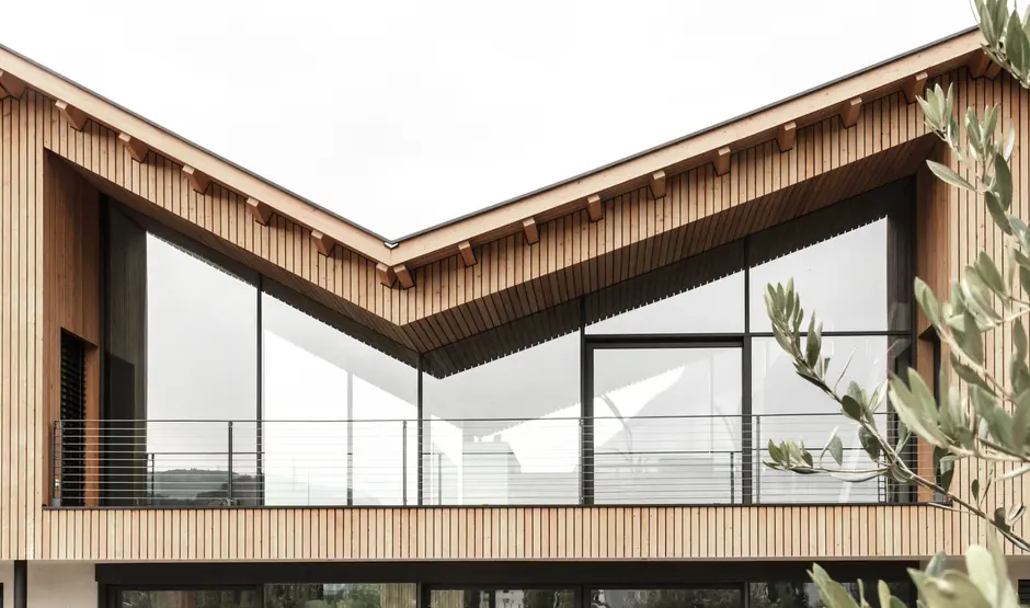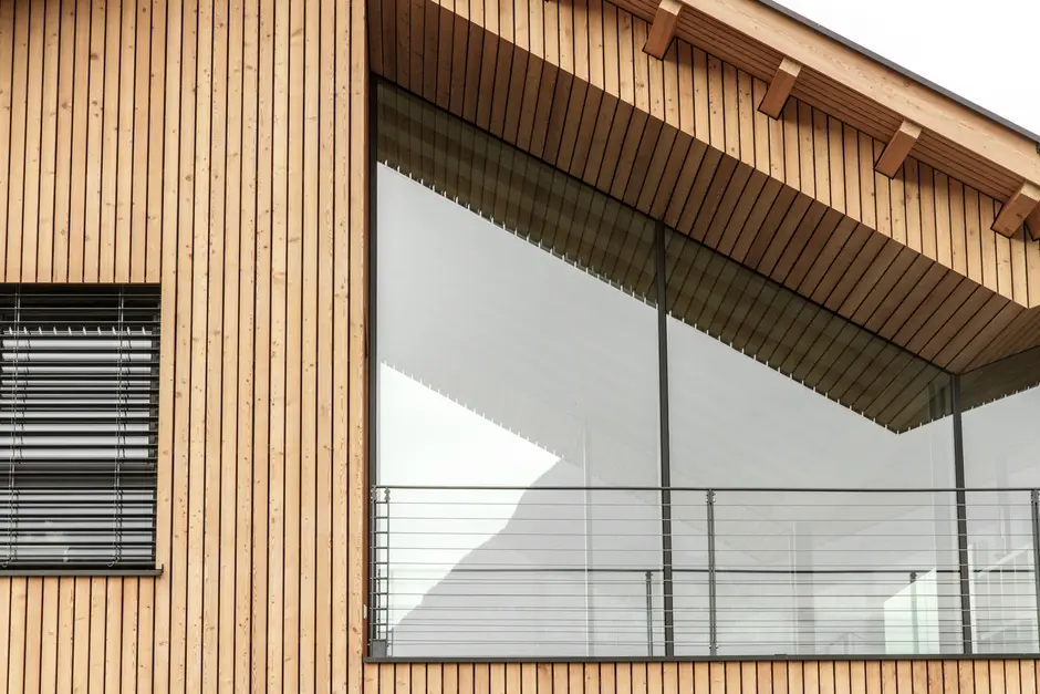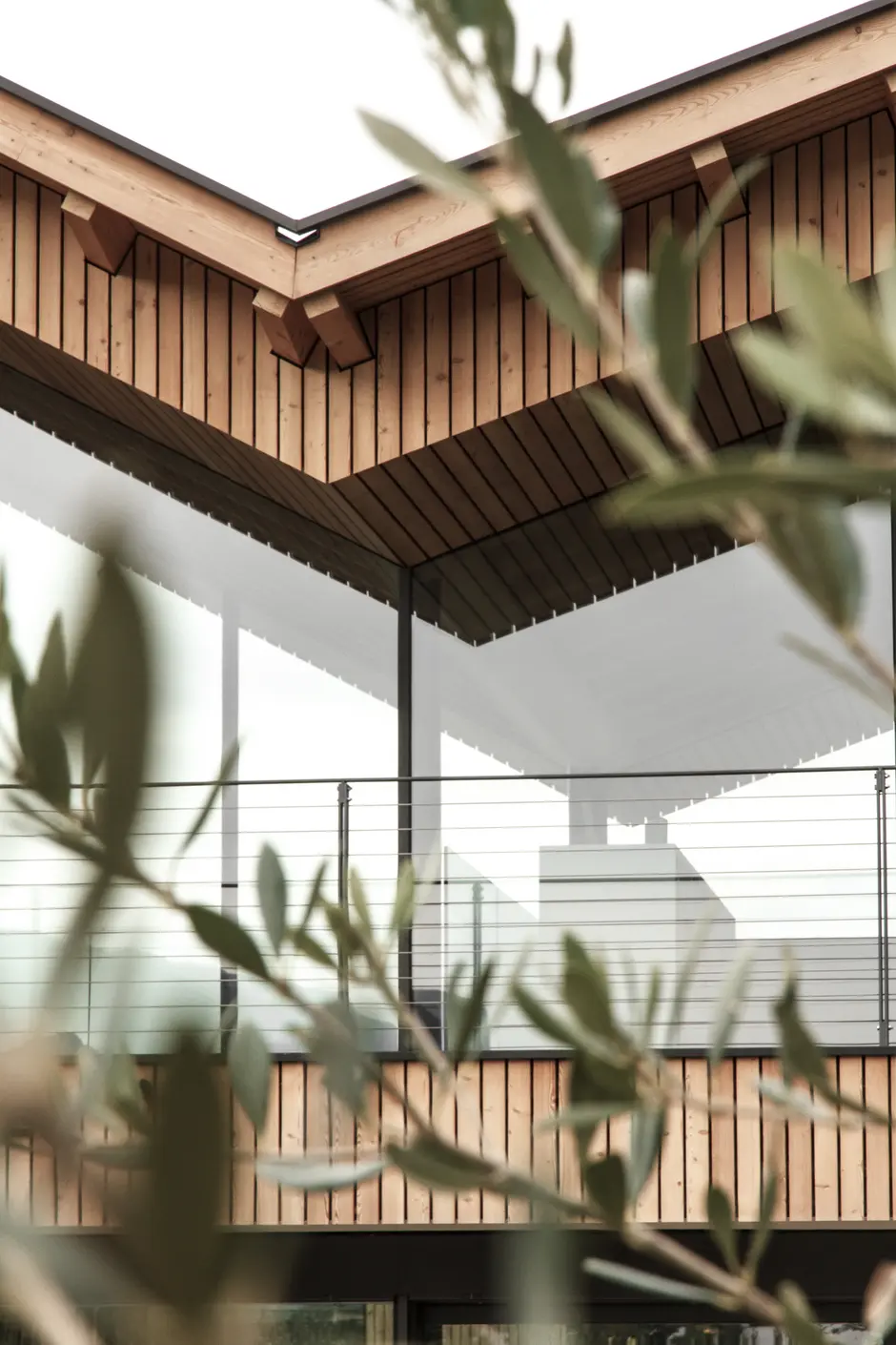 Die Konstruktion folgt einem klaren Prinzip: Das Erdgeschoss in massivem Ziegelmauerwerk mit Vollwärmeschutz und grobkörnigem Putz bildet das Fundament, darüber wächst ein leichtes Obergeschoss in Holzbauweise mit Holzschalung, das die warme Materialität der Umgebung aufnimmt. Die Dächer – ein zweiteiliges Satteldach beim Wohnbau, ein Flachdach beim Wirtschaftsgebäude – formulieren eine ruhige, prägnante Silhouette. Sonnenschutz wird konstruktiv gedacht: Auskragende Terrassen und Raffstore-Lamellen mit matter Oberfläche sorgen für Beschattung und Lichtlenkung.