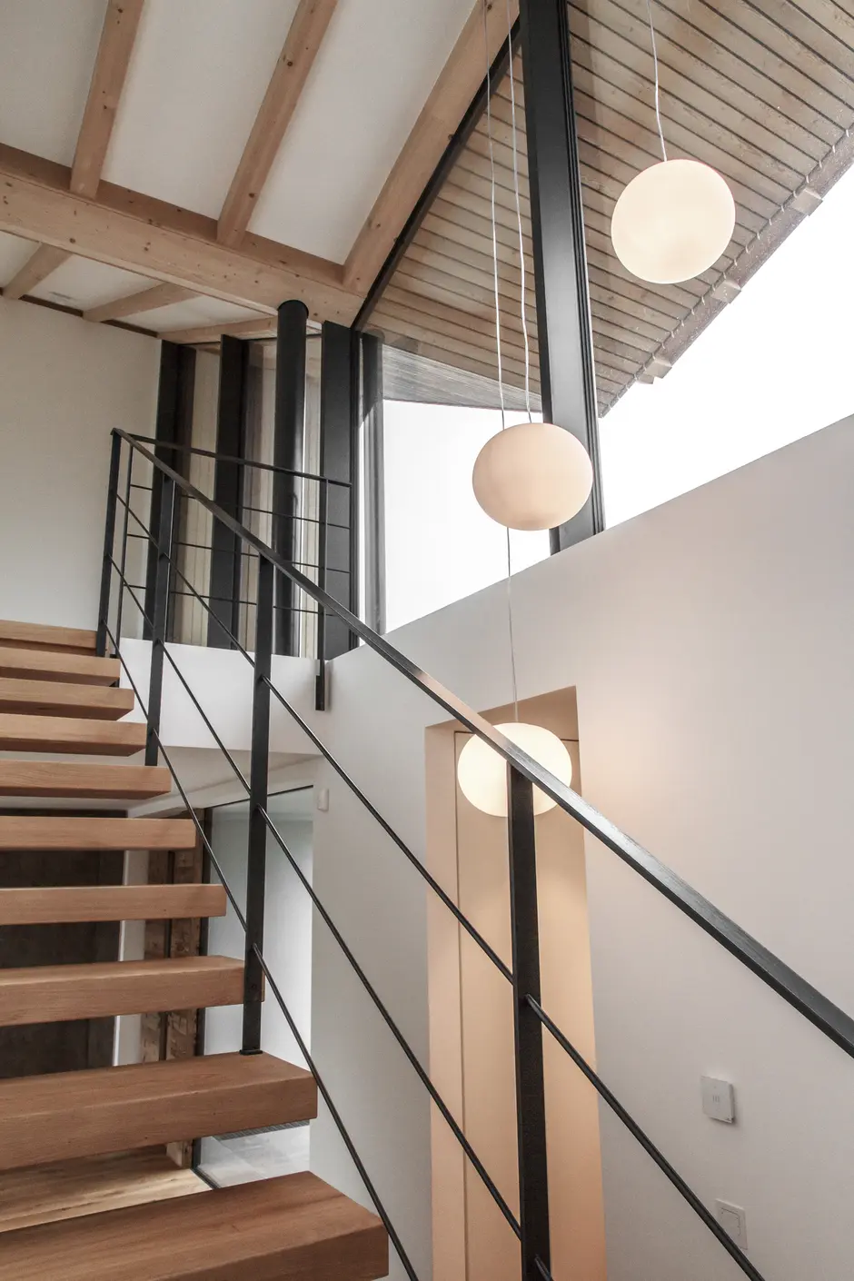 Die Architektur sucht bewusst die Einfügung in den Ort. Durch die sich überschneidenden Satteldächer wirkt das Volumen des zweigeschossigen Wohnhauses leichter und kleinteiliger, als es tatsächlich ist. So entsteht eine harmonische Einbettung in die bäuerliche Struktur, ohne den Anspruch an zeitgemäße Wohnqualität zu verlieren. Das Wirtschaftsgebäude ordnet sich bescheiden daneben an – ein funktionaler Baukörper für Maschinen, Geräte und Imkerei, während das Wohnhaus durch Offenheit und Großzügigkeit geprägt ist.