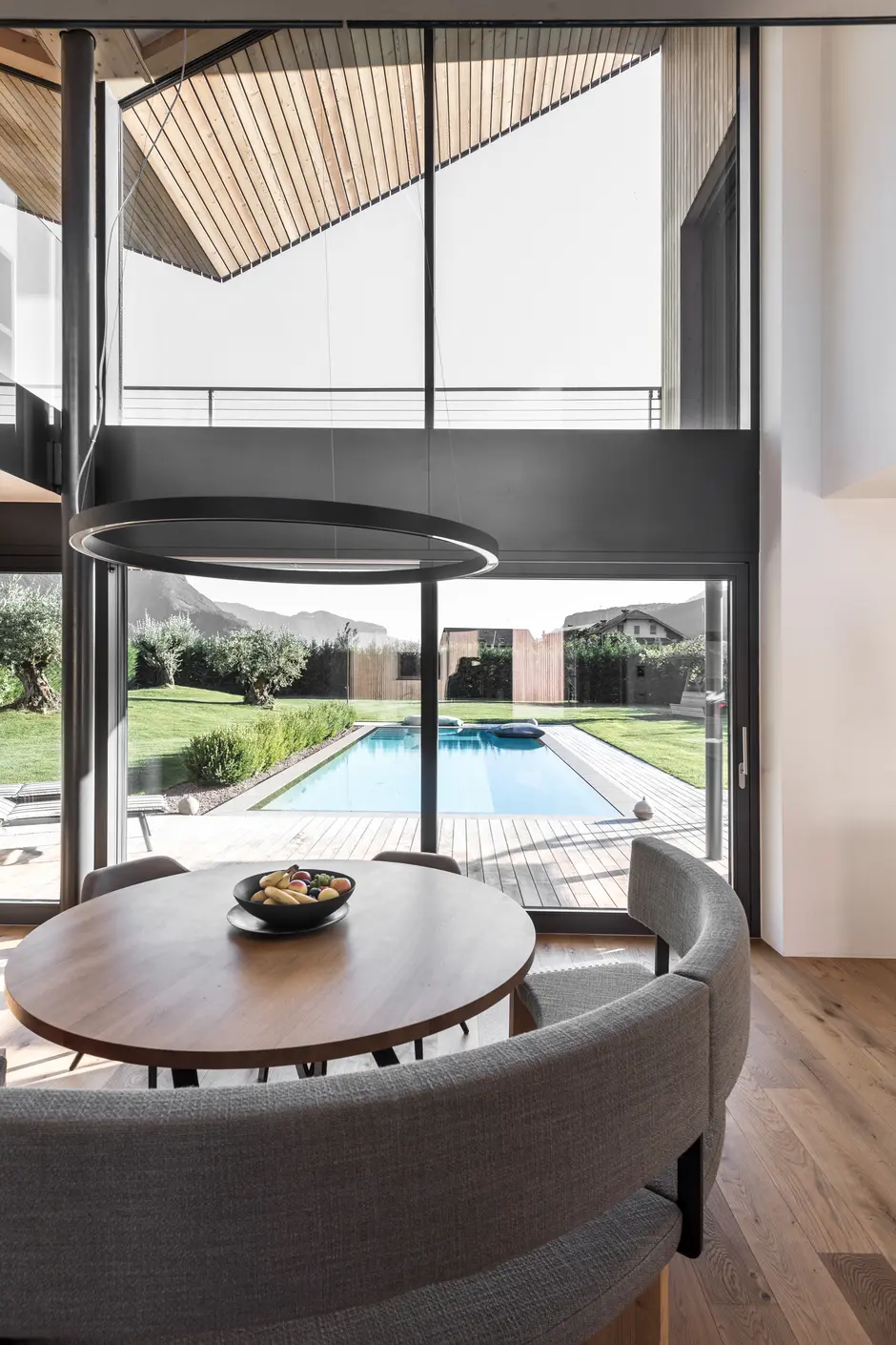Im Inneren spannt sich das Raumkontinuum von Kochen, Essen und Wohnen über beide Geschosse, erweitert durch großflächige Terrassen, die das Wohnen ins Freie verlängern. Nach Süden öffnet sich ein privater Garten mit Schwimmbad – ein Ort der Ruhe, eingebettet in viel Grün und mit weitem Blick in die Landschaft. Die Schlafräume und Bäder im Obergeschoss folgen dem Prinzip der Geborgenheit, während das zentrale Treppenhaus den inneren Übergang zwischen Tag- und Nachtbereich markiert.