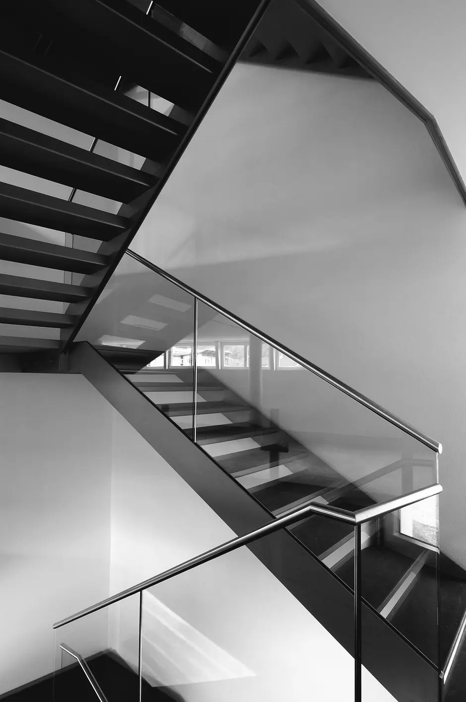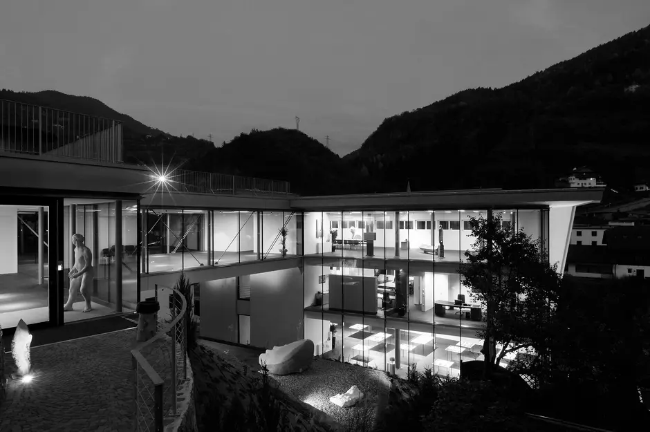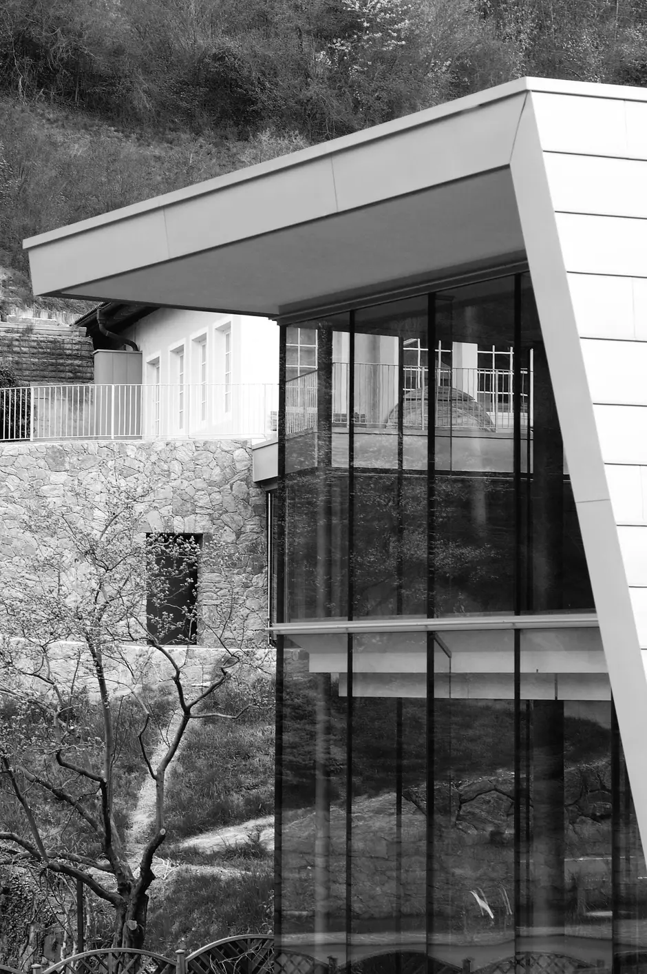 Dieses Spiel der Schrägfassade und Dachfläche präsentiert sich als homogene Ganzheit in Form von raffinierter Klammerstruktur. Zugleich wird durch die Anordnung der Schrägfassade optisch ihre Höhe genommen und so dem Volumen ein dynamisches Erscheinungsbild verliehen. Last but not least gelang es durch dieses Konzept, ein Bauwerk zu realisieren, das sich einerseits als Begrenzung zur Straßenflucht behauptet und sich andererseits dem aufsteigenden Hang entgegensetzt.