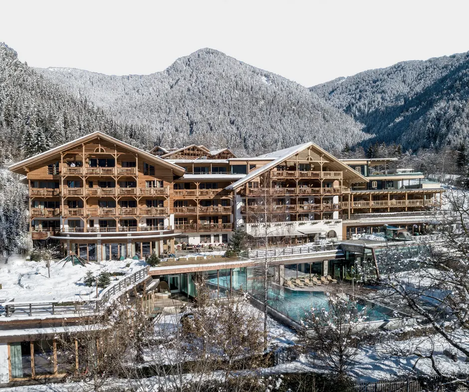 Einheimische Hölzer, wie die Fichte, Lärche oder Zirbel korrespondieren mit Natursteinplatten und Glas. Dem ganzheitlichen Naturkonzept verbunden, besitzen alle Gästezimmer in dem Hotel großzügige Fenster und damit Kontakt nach außen in die Natur.