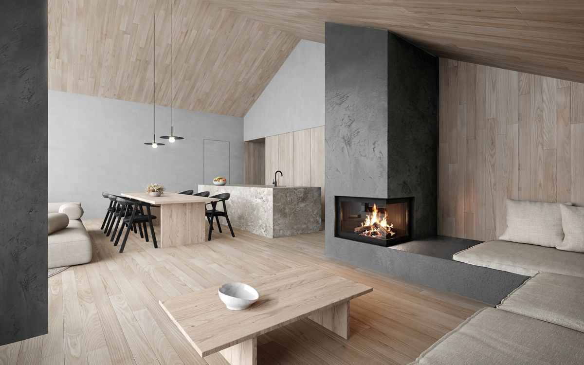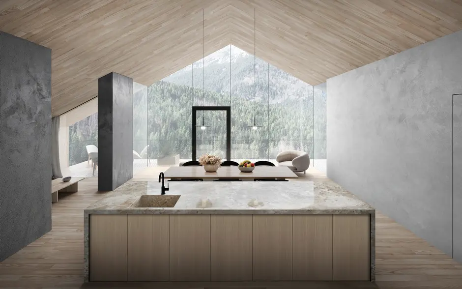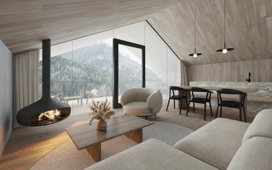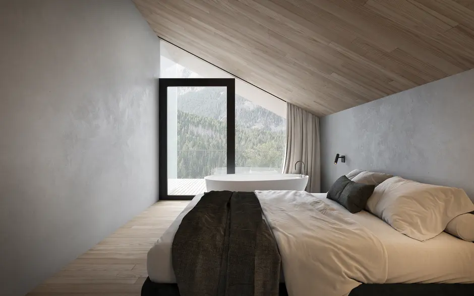 Gestockter Sichtbeton mit Dolomitzuschlag, Fassaden und Fenster aus unbehandelter Lärche sowie Satteldächer mit grauen Ziegeln verankern das Haus in der lokalen Bautradition und lassen es würdevoll altern.