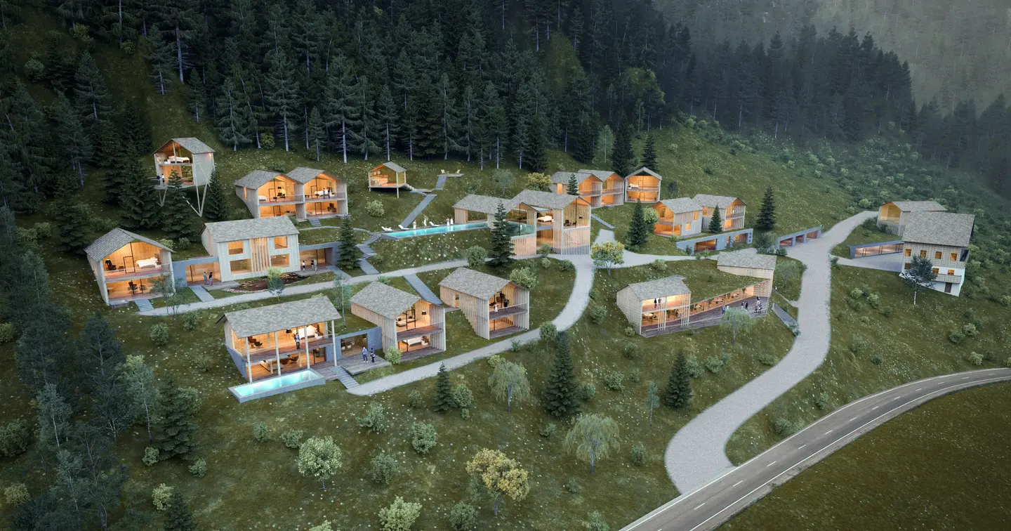 Locker auf einer sonnigen Blumenwiese am Waldrand gelegen, bildet dieses moderne Chaletdorf ein stimmiges Ensemble aus Natur, Architektur und alpinem Lebensgefühl. Die Chalets – in zeitlos moderner Holzbauweise mit viel Glas, natürlichen Materialien und silbergrauen Lärchenschindeln – sind dezent am Hang verteilt und gewähren dank ihrer abgestuften Anordnung freie Aussicht und maximale Privatsphäre.