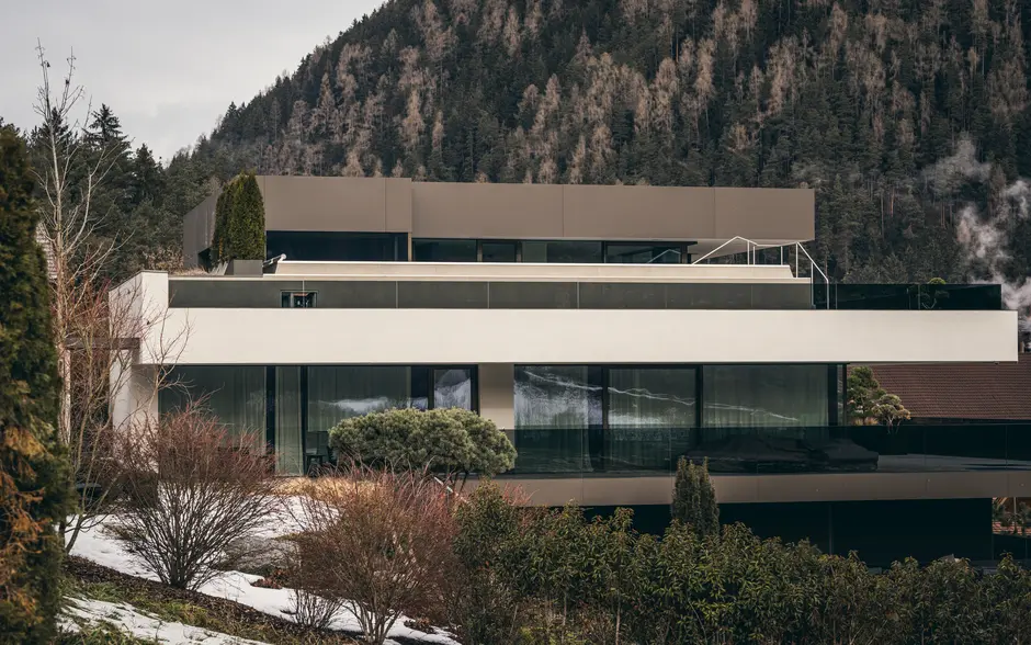 Modernes Wohnen am Eingang ins Gadertal - in einer Villa mit klaren, linearen, minimalistischen Formen, als zeitgenössischer Kontrast zur umliegenden, ortstypischen ländlichen Architektur. Die einzelnen Stockwerke sind zueinander versetzt in den Hang geschoben, dadurch wirkt der Neubau niedrig und ist harmonisch in die Wiesenlandschaft eingefügt. Großformatige Infinityverglasungen holen die Natur ins Rauminnere für ein lichtdurchflutetes Wohnen.