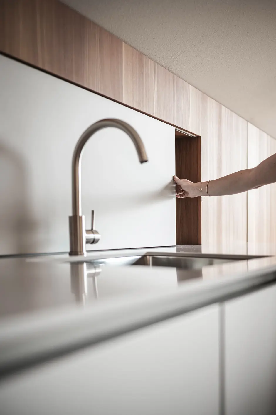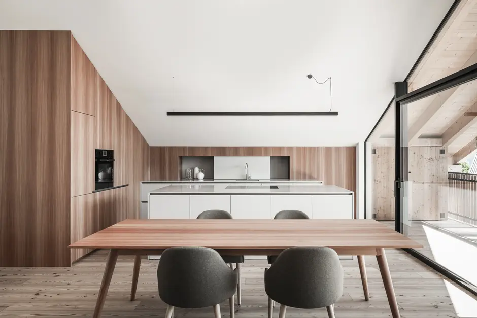 Großzügige Verglasungen holen das Licht der Südtiroler Bergwelt bis tief ins Innere und lassen Innen- und Außenraum auf selbstverständliche Weise miteinander verschmelzen. Der offene Grundriss erlaubt fließende Übergänge zwischen Kochen, Essen und Wohnen – ergänzt durch fein gearbeitete Details, klare Linien und eine präzise Möblierung, die sich zurücknimmt, ohne an Präsenz zu verlieren.
