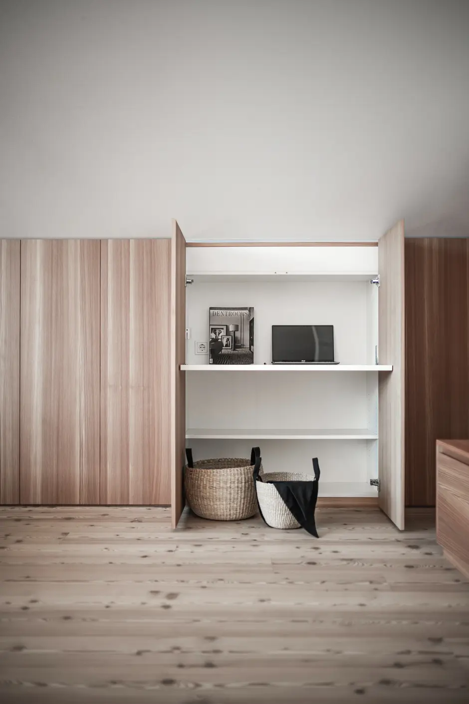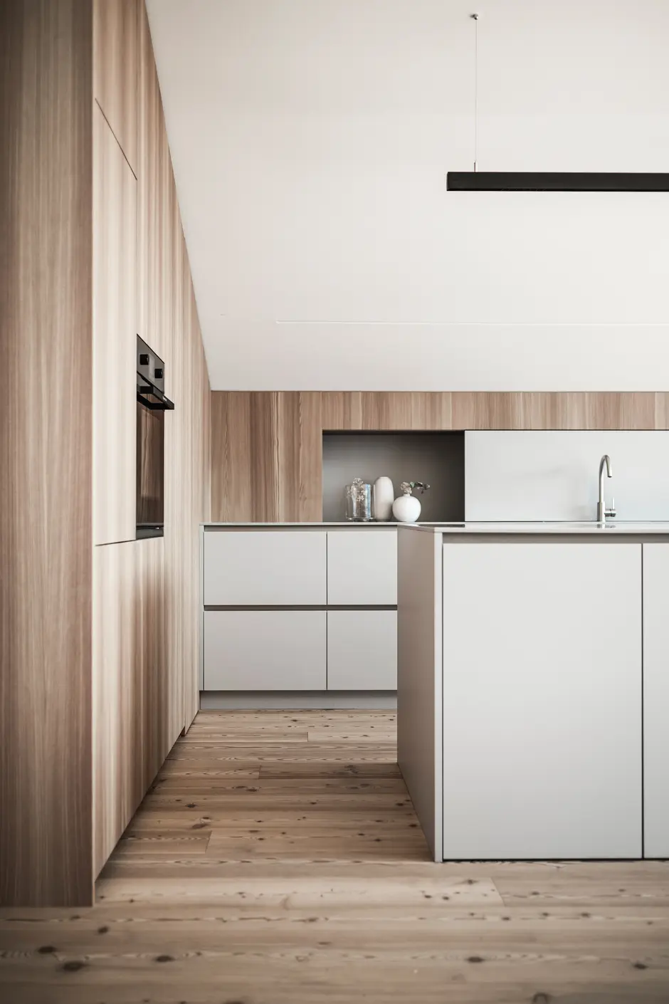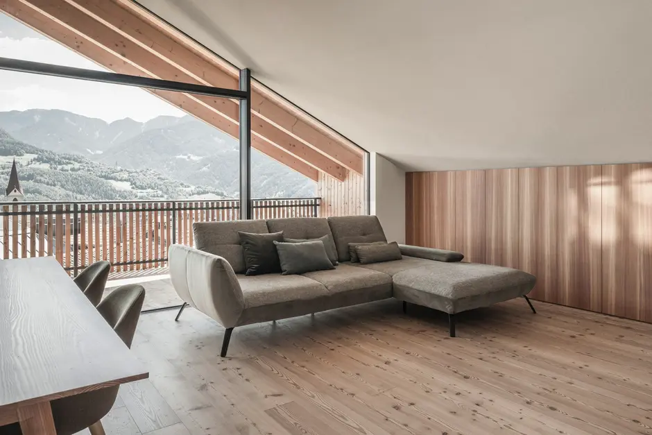 Inmitten des Ortskerns von Feldthurns wurde ein Dachgeschoss in ein modernes Refugium verwandelt – ein Ort der Ruhe, Klarheit und Offenheit. Der Umbau folgt einem zurückhaltenden, aber kraftvollen Gestaltungsansatz, der die Essenz der Architektur auf das Wesentliche reduziert und dabei den Blick in die Weite öffnet. Helle, gebürstete Lärche prägt das Materialkonzept – fein nuanciert, natürlich und zeitlos – und verleiht dem Raum eine warme, fast schwebende Atmosphäre.